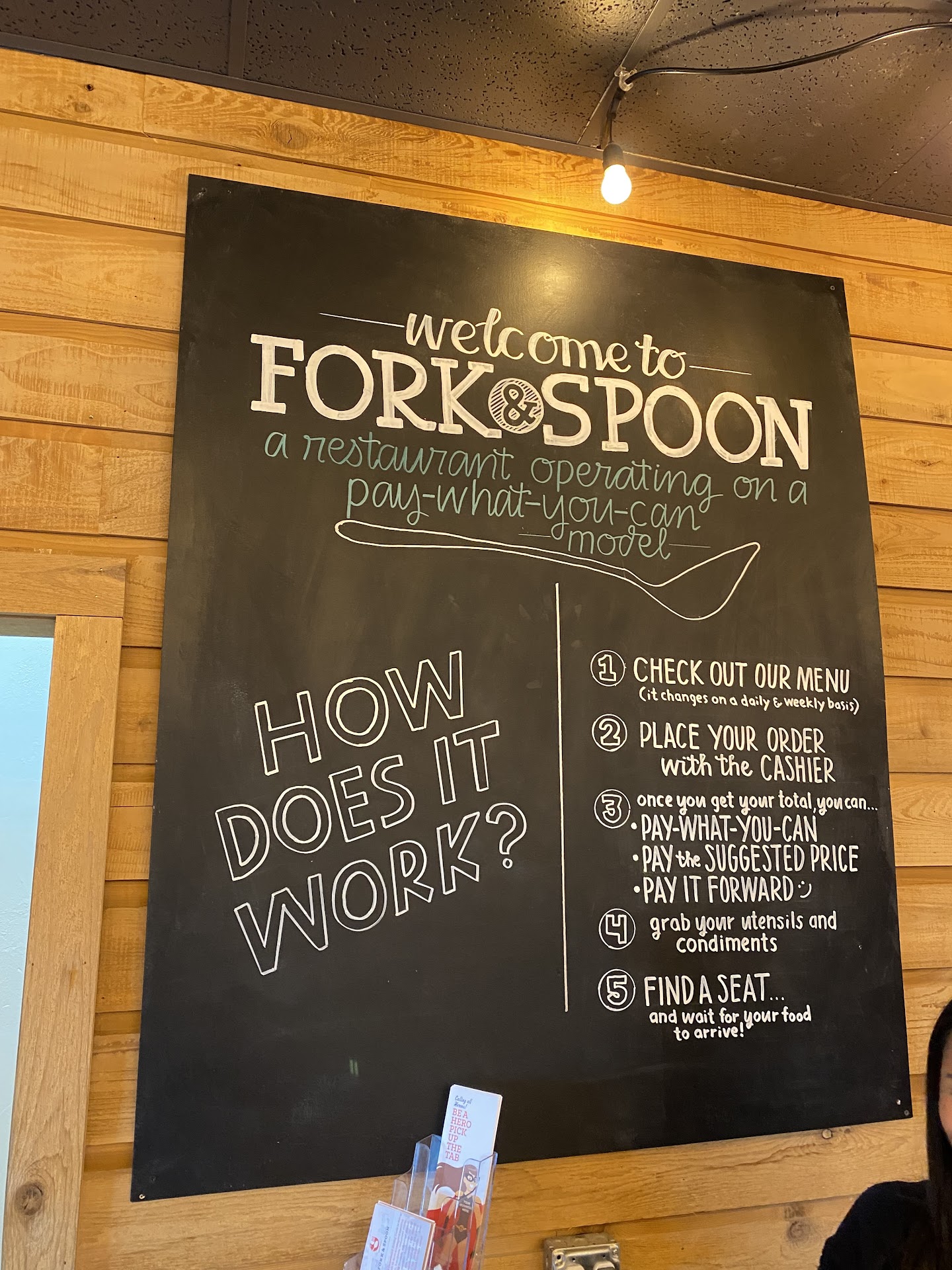 It is truly pay what you can, there is no pressure or pricing - they simply ask if you'd like to contribute to your meal after you order. Was nice contributing as much as we would have spent going out to eat but knowing that what we gave will help others get a warm, delicious meal.