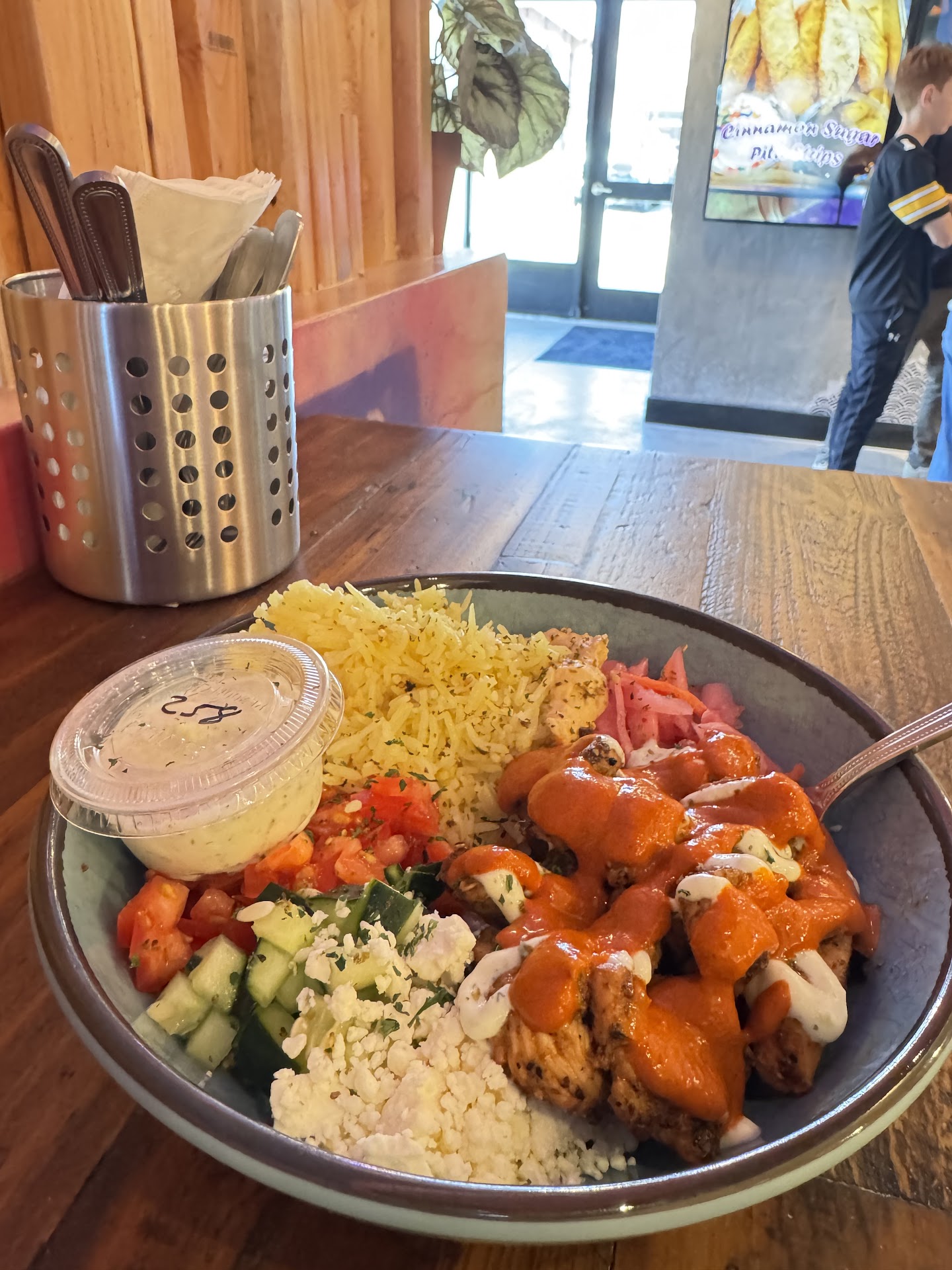 Read moreWent to see what all the hype was about and it definitely lives up to it! Spitz rules! From the get go the service was top notch. There was a line when I got there but they cruised through it fast! One employee taking orders at the register while another took orders on a handheld device. The kitchen cruised through the orders while still paying attention to detail and making every order with love. I mean, just look at my bowl and tell me it wasnât made with love and it only took maybe 5-10 minutes! If you wanna know, I got the Medi bowl and the nice employee let me in on a little secret and hooked it up with a side of harissa to add to my chicken. BOMB.COM. The employees were so friendly and were constantly ensuring the lobby was clean and that customers were enjoying their meals. The vibe of this place is so cool! Vintage mixed with street art mixed with local favorites. Theyâve got vinyl records lined up along the backside of the bar and in the bathrooms, murals of the mountain range, bobcats, and wolves! This is exactly what Bozeman needed and I will without a doubt be back to try out the rest of the menu. Thanks for bringing some character and charm to...