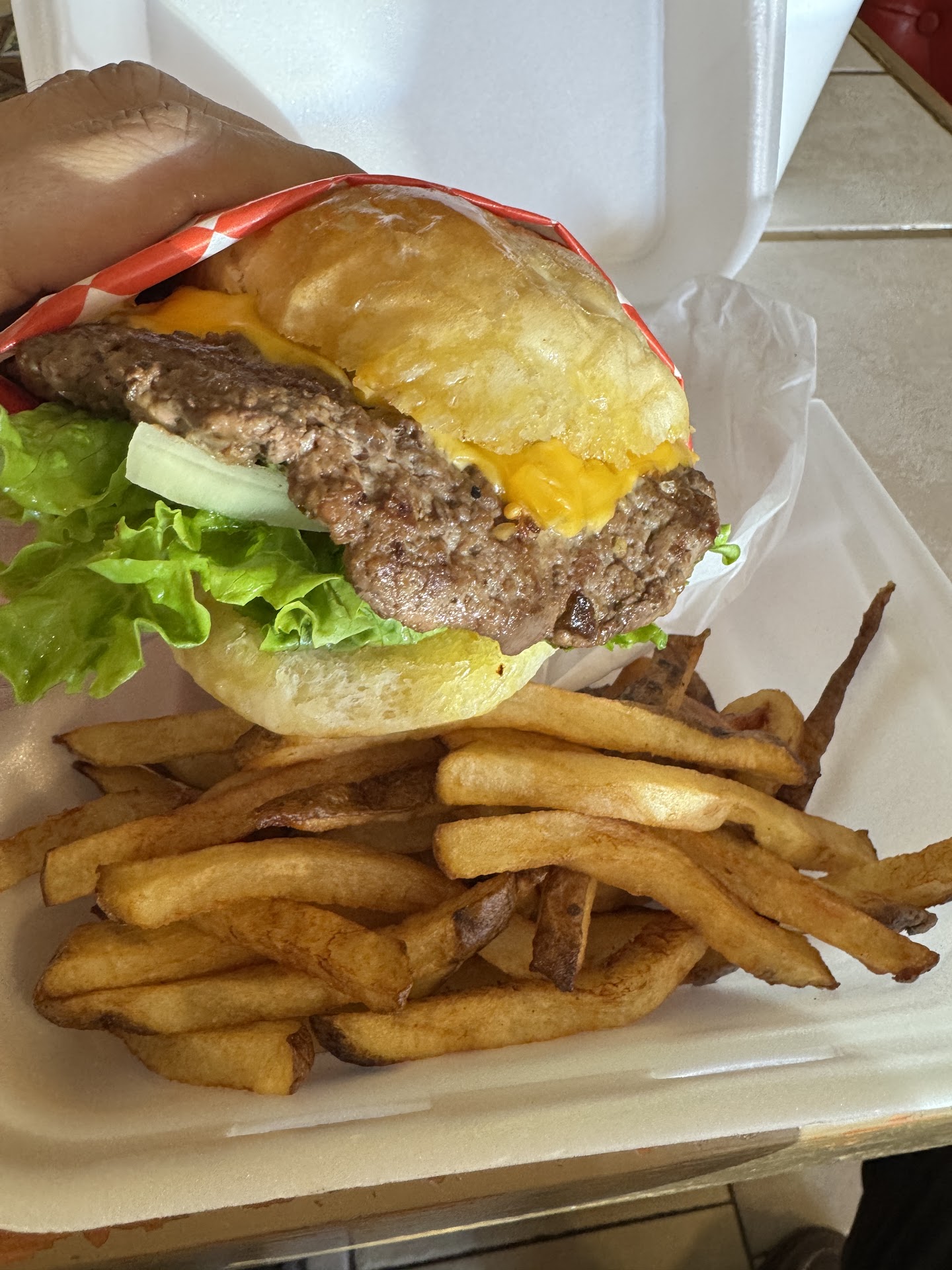 While staying here in brackettville Texas I decided to have something a little different and because of Google pictures I was able to see a burger that looked unique, so I came here to Julie's place in order the Mexicana Burger with fries. It comes on a homemade bun which takes it a little over the top in flavor and the fact that bun holds together better than a traditional bun. The burger had grilled onions bell peppers pepper jack cheese, avocado slices, lettuce and tomatoes, but not sure on condiments because the flavor was really good and I almost forgot a small thin slice of ham that was also grilled to give it that added flavor. The fries were normal and service was fast and friendly by the young lady at the front desk. I would definitely recommend the Mexicano Burger if you're looking for something a...