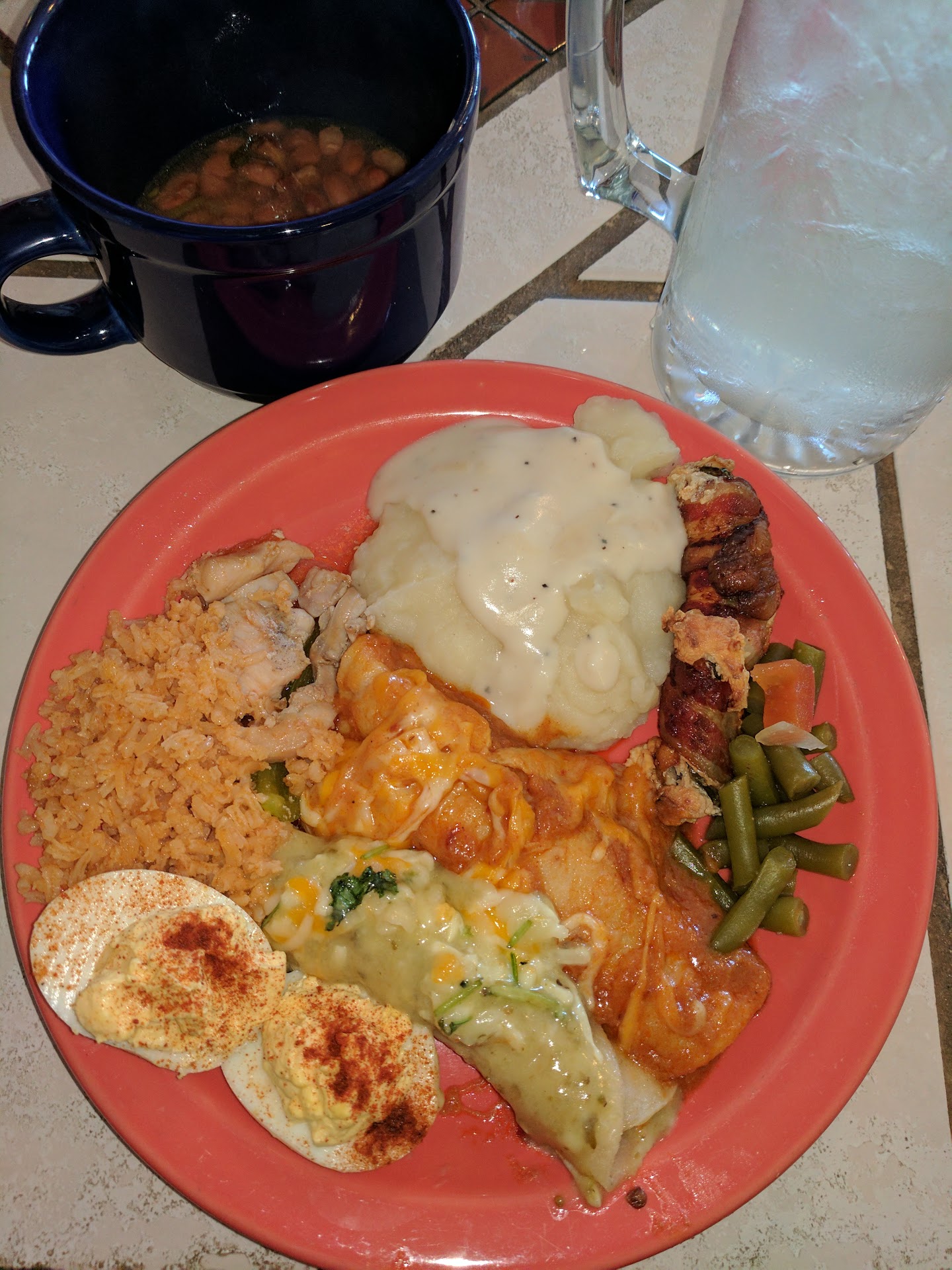 The chicken was perfectly seasoned with crunchy skin and moist meat. The barracho beans were in a crock pot and just melted in your mouth. There was even deviled eggs!
