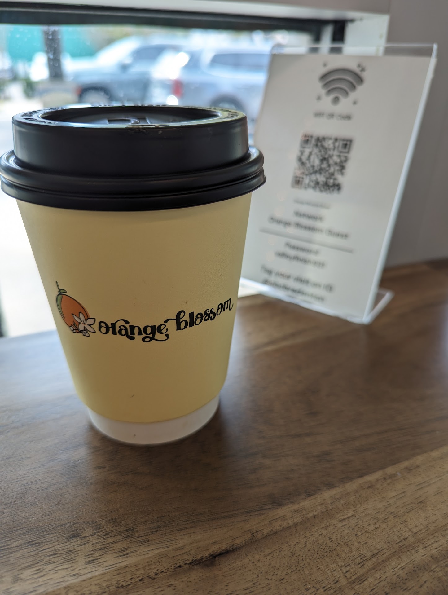 Read moreThis is a really nice local coffee shop, hard to find around here!! All the coffee drinks are great, and there are some alcoholic drinks too like mimosas and beer. They have a little bit of snacky food, mostly breakfast, and some of it is hit or miss like scones and donuts - depends on local delivery. I think thatâs part of whatâs great and unique about local places though, itâs not always the exact same thing but you know it will be good. The seating is really nice inside and out, and the place is a nice homage to Florida oranges, as youâd guess from the cafeâs name! Itâs very cute and cozy, a great place to chat with friends or work on a laptop. Good shopping nearby too. We like to bring our family dog, who LOVES it here!! They gave her a âpup cup,â which made her day! She sits to people watch, and she gets a lot of traffic and love -...
