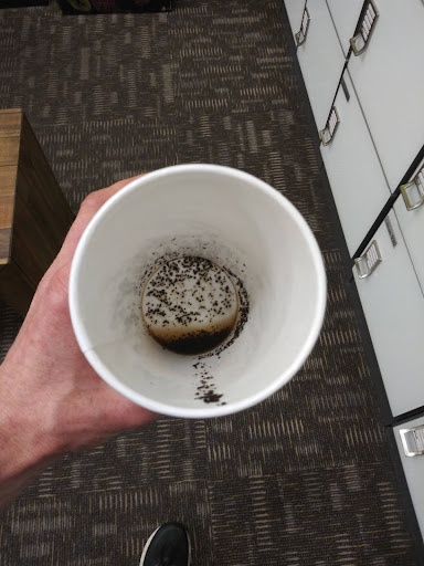 Perfect! Available, hot, no grounds at the bottom, and the fixins were clean and stocked.