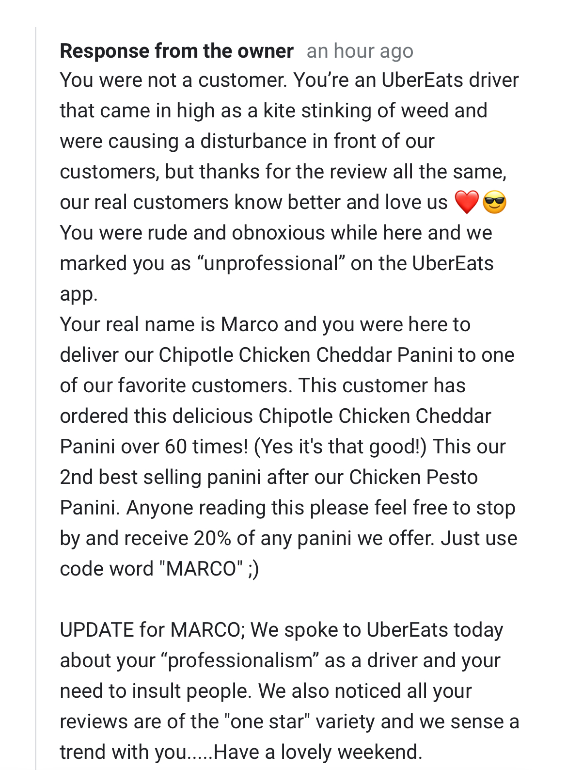 Update: you’re just making things worse for you, first you accused me of being “high” then accused me of disorderly conduct, then accused me of being abusive towards your employee. Before falsely accusing me, you should’ve reviewed the video from that day, I’m pretty sure you’ll be surprised how...