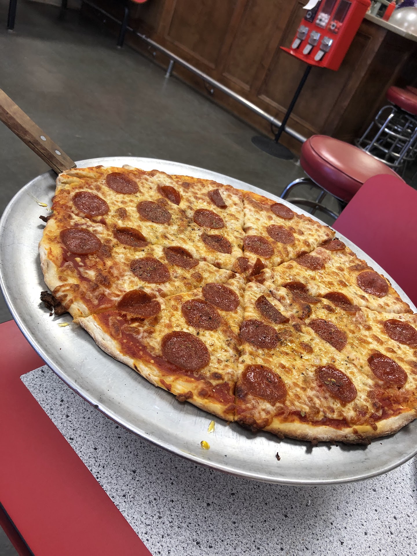 The place is great on the inside, incredible aesthetic, but I have had very 50/50 shots with the service and food in the past two years or so. I used to order their pizza and sides for small hangouts with friends because it was the closest to thin "ny style" pizza. But as of late, I have strayed away from ordering anything but their appetizers. The pizza became flavorless and dull compared to something else local like Renna's. And the people working are still 50/50 of if they know at all what they are doing or appear competent at all. I ordered their pizza calzone once and it was awesome!! But tonight I ordered some calzones for me and my dad online and took it home, and we opened the boxes to the crusts of the calzone having completely raw dough but also burnt on the tops. My dad who picked up the calzones informed me the workers were struggling to get one out of their oven due to it being burnt. And my pizza calzone was lacking in ricotta or any inside ingredients in general, quite small compared to what i had previously received. However, we called and we were given a refund. But it still makes me hesitate to order anything else...