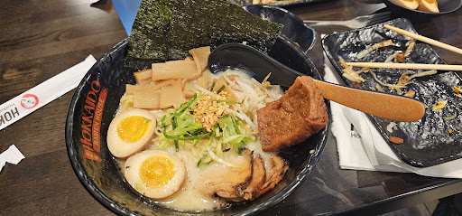The first thing that I noticed was the entry glass door. It was very smudged, dirty and appeared to have been washed with a very dirty wet towel. Homemade paper notices were taped to the glass. I really wanted to like this place, but we were off to a shaky start. In fairness to the restaurant, I need to mention that this was their “soft opening”. Since they do not have a website of any kind, and Hokkaido corporate site only directs you to Google Maps, and the local newspaper is as dead as our mall, there was no way to know that they were only seating parties with reservations. Thus the notices on the door (!). A little late to be told. After a short barter session with a young male that appeared to be in charge, we were reluctantly seated- a party of four-at a table near the porcelain diorama of two large men in diapers squaring off in an imaginary wrestling match. The table was near the west all-glass wall where the sun was shining so brightly that it was very uncomfortable for diners facing the window. There were no shades of any kind. The table next to us made it clear in his very loud conversation with his dining partner that he knew the owner of the restaurant from his patronisation of his other restaurant. His clout wasn’t much help since the couple was forced to switch seats to avoid the bright sunlight in their faces. The calamari appetiser was rubbery and consisted of eight (8) pieces. Not good. The seared tuna appetiser was served without wasabi, without ginger and was kind of mushy. The stuffed jalapeños with spicy tuna was not on the misprinted menus. The ramen dishes were pretty good except when considering the price point. In the final analysis, it’s RAMEN! Service was nonexistent until we flagged down a server at a nearby table. Our order was correct but took about 45 minutes. The most remarkable thing to me is that the owner of the business was on the premises and visibly up front most of the time we were there. Except for the reunion with our neighbors, he never appeared to be concerned with our table of four, squinting from the sun in our faces, without drinks nor food for as long as we waited. There was never an offer to refill drinks or to provide any additional service by our server. She just disappeared. As we were sitting at our table, I noticed several paper items discarded in the dining room’s . The employees simply stepped over or on the garbage and went about their business. No one cared. I imagined what the kitchen looked like. Very unprofessional and careless. As we left, I saw a young couple walk in. It was around 8 PM. The young male at the register explained that it was reservations only tonight. The restaurant was very nearly empty including the rear section that was completely empty. The customers, or wannabe customers, politely left. I was embarrassed for the restaurant for being so impolite. Thanks but no thanks to future visits to Hokkaido or any of the restaurants in the owner’s empire. Disorganised, unclean, untrained waitstaff, oblivious owner, rude uncaring management, topped off with overpriced food makes for a very bad experience.