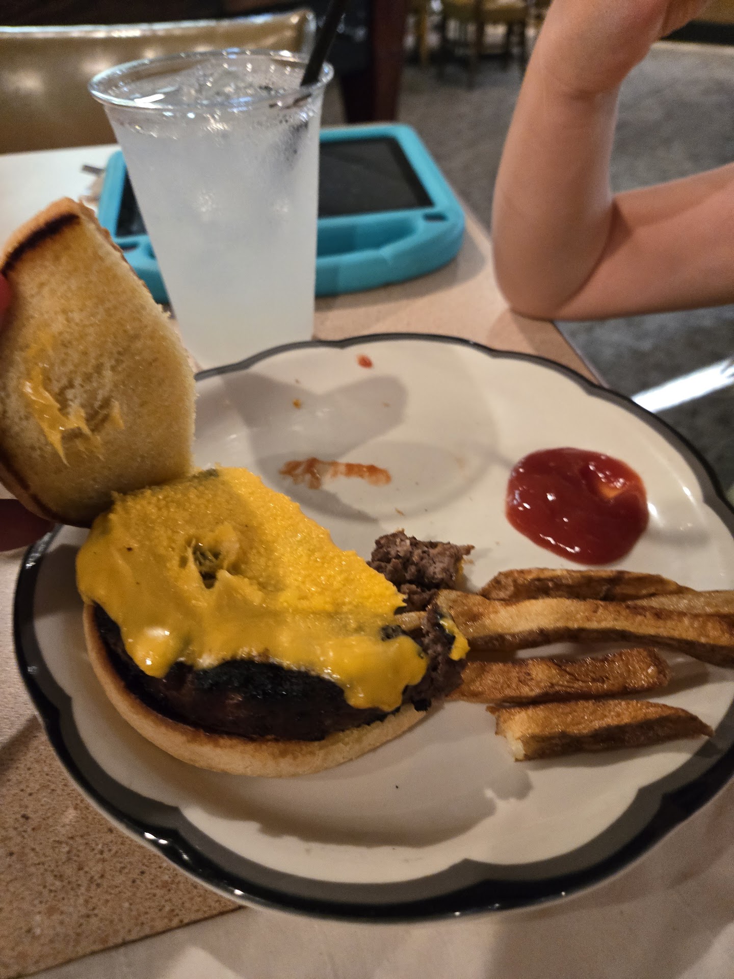 The "half eaten fries" on my child's plate you should know aren't even served with the $12 burger. They were served with my Italian combo sandwich, which I shared with her. As for how long it has sat, I cut the sandwich and took the picture. So yes, burnt with hardened cheese is exactly how it was served. When i say forced it is due to absolutely no option on the menu for a child to choose from. Had to feed her something so your overpriced, over cooked, perfectly round (pattied on a machine) was the option The steak sandwich on the other plate that you referenced as a thick generous steak was tough as shoe leather and full of fat and gristle. Not sure I could have a personal issue with a peson I've...
