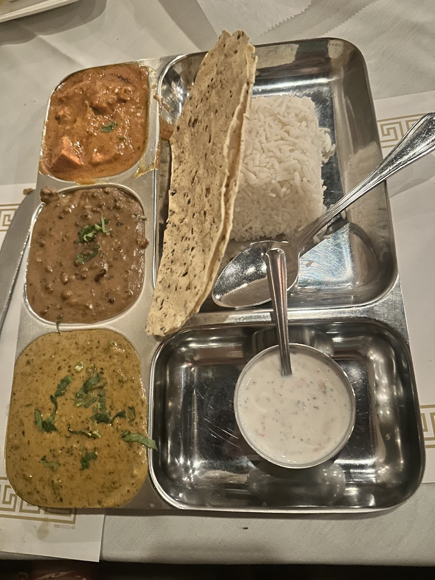 We ordered the sample platter, mango lassi, goat and chicken curry to share and Nil brought us plates to share from. We ate our fill, although the star of the night was the mango lassi. Never had a better one in my entire life. Not too sweet, served with whipped cream and a cherry drizzle. The goat curry was the best, the spice level can be chosen when you order as well which soothed my sadly bland American palette.