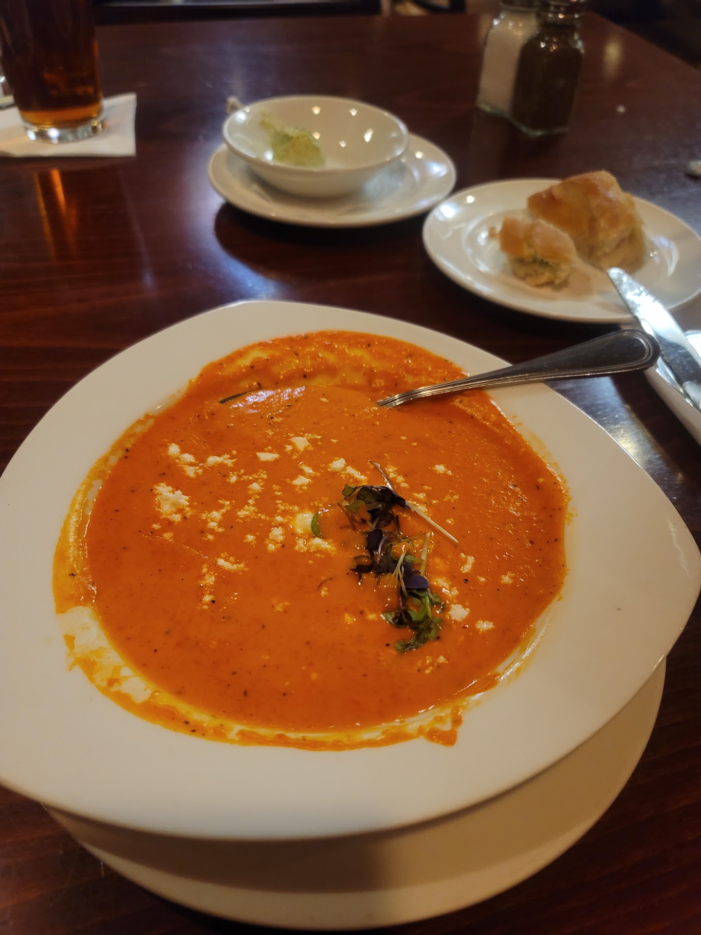 We've been here three times now, each better than the last! Sunday brunch was quite a few months ago and we really enjoyed it. Kept saying we would go back but didn't get the chance until two weeks ago Saturday. Out for the cold day in the country, we stopped in on the way home for a 5pm early dinner. We were seated at a bar top. I had a glass of their red sangria. Very good, but very strong, I had to slip slowly! My husband had a Tullamore on the rocks. He ordered the crusted chicken over pasta....wow!! It was awesome! I got half a rack of ribs. They were faall off the bone tender, not dry at all and extremely flavorful! Served with sweet potato wedges -they call them fries but they were HUGE!! So good! We were served warm rolls and garlic herbed butter before our meals came and I almost liked the butter dish! Very cool jazzy combo playing that afternoon as well. We went back for dinner this past Friday. We called for reservations as we thought they would be busy. Good plan! We were seated quickly ( my only complaint, if you call it that, was we were the first table in the dining room and every time the front door opened I got blasted with artic air! Brrrrr). I ordered the Chocolate martini, so yummy that I had 2! My husband had a beer. Our waiter, AL, was so friendly. After hearing the specials I ordered the red pepper soup special. My husband got the crab and corn chowder. We got bread and rolls to the table first of course...and my only true complaint was that instead of offering more bread to go with the soup, when the soup was ordered the cleared the bread plates and butter! Anyway, all was forgiven once we began....the soups...both...we're wonderful! The red pepper soup was smooth and delightfully seasoned. With just the right bite. The crab and corn chowder was thick and hearty without being overly goopy as some chowders can be. Next was entrées; I got the seared salmon with orange ginger glaze and my husband got the shrimp scampi. The fish was cooked perfectly, the rice was Fluffy and the mixed steamed veggies still slightly crisp. It ended up being a bit too peppery for me, much to my disappointment. It tasted wonderful, but I just couldn't finish it due to the heat. My husband loved his dcampi, with big shrimp, tails on and really yummy sauce. We both were full and turned down desert. But will go back to try it out! There was a single jazz guitarist playing and it was the perfect dinner music!! Bottom line...we're bringing friends as soon as we can. I probably shouldn't post this......they'll get to busy!! Haha!! Oh, the the prices are so good too...alot of value here for your hard...