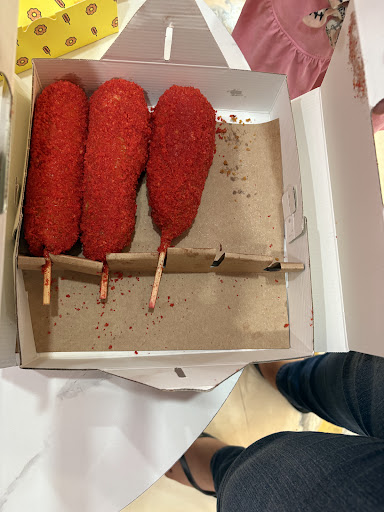 The corn dog was fried perfectly. It was so crispy on the outside. I was even asked if I wanted sugar sprinkled on top of it. Yes, please!! The taste of the sweet potato with the cheese reminded me a little of the cereal topped ones. It made a good savory & sweet bite. One corn dog was enough for me. It's huge! The half cheese & half hot dog is my favorite.