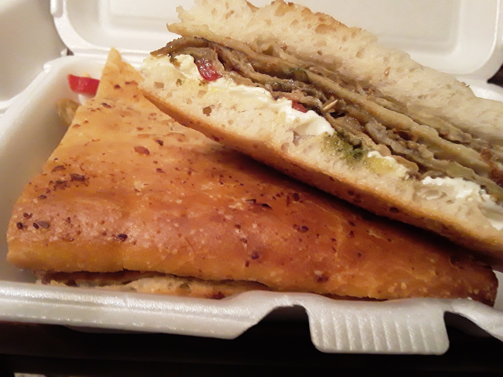 We were not sure how the sandwiches would be but I am so glad we got them!! Best bread!! I got the eggplant pesto focaccia and my family got the orange chicken. The Eggplant was nice and tender! I didn't expect orange slices on a chicken cutlet but we really enjoyed it!! Roasted red peppers seemed fresh & were perfect on both sandwiches and THE BREAD!! the focaccia bread is fantastic!! Fluffy and slightly crispy with some rosemary on it!! Sandwiches were warm but not over toasted or burnt like some focaccia sandwiches I have had at other establishments.