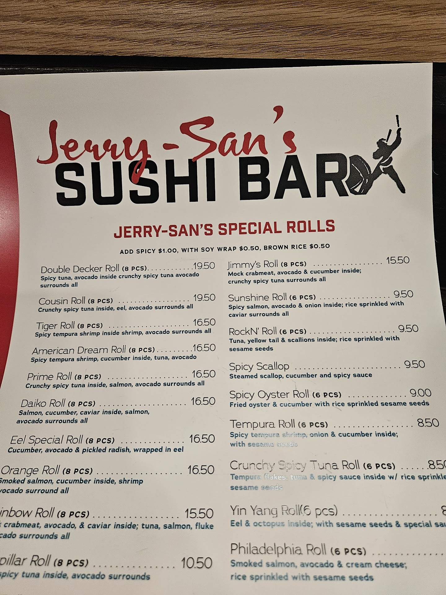 Read moreJerry Sans is a must-visit! I’ve been here multiple times and each visit has been incredible. The atmosphere is nice and cozy. Whether you're sitting at the bar watching Jerry skillfully prepare sushi or at a table being served by the sweet and friendly CJ.