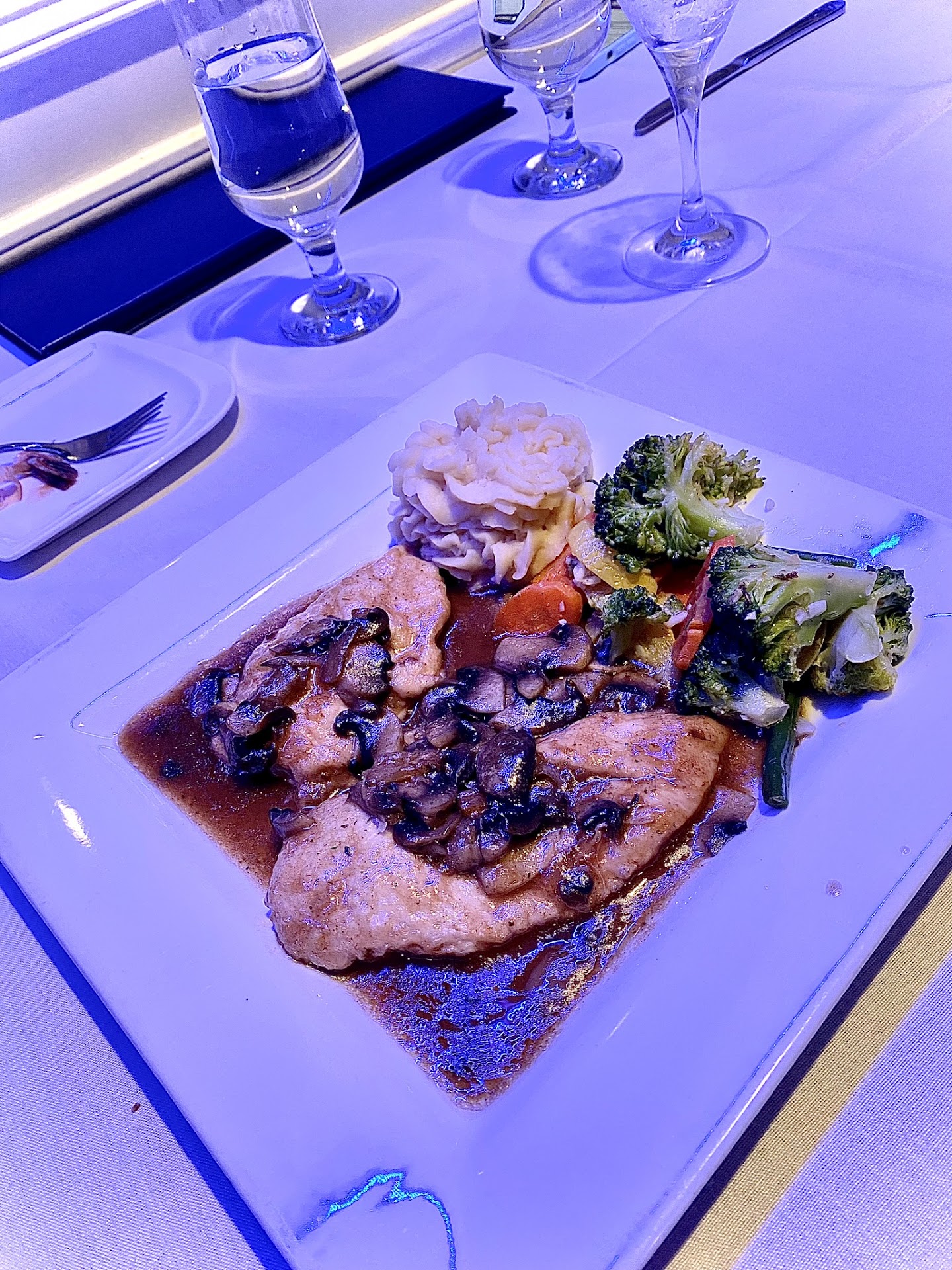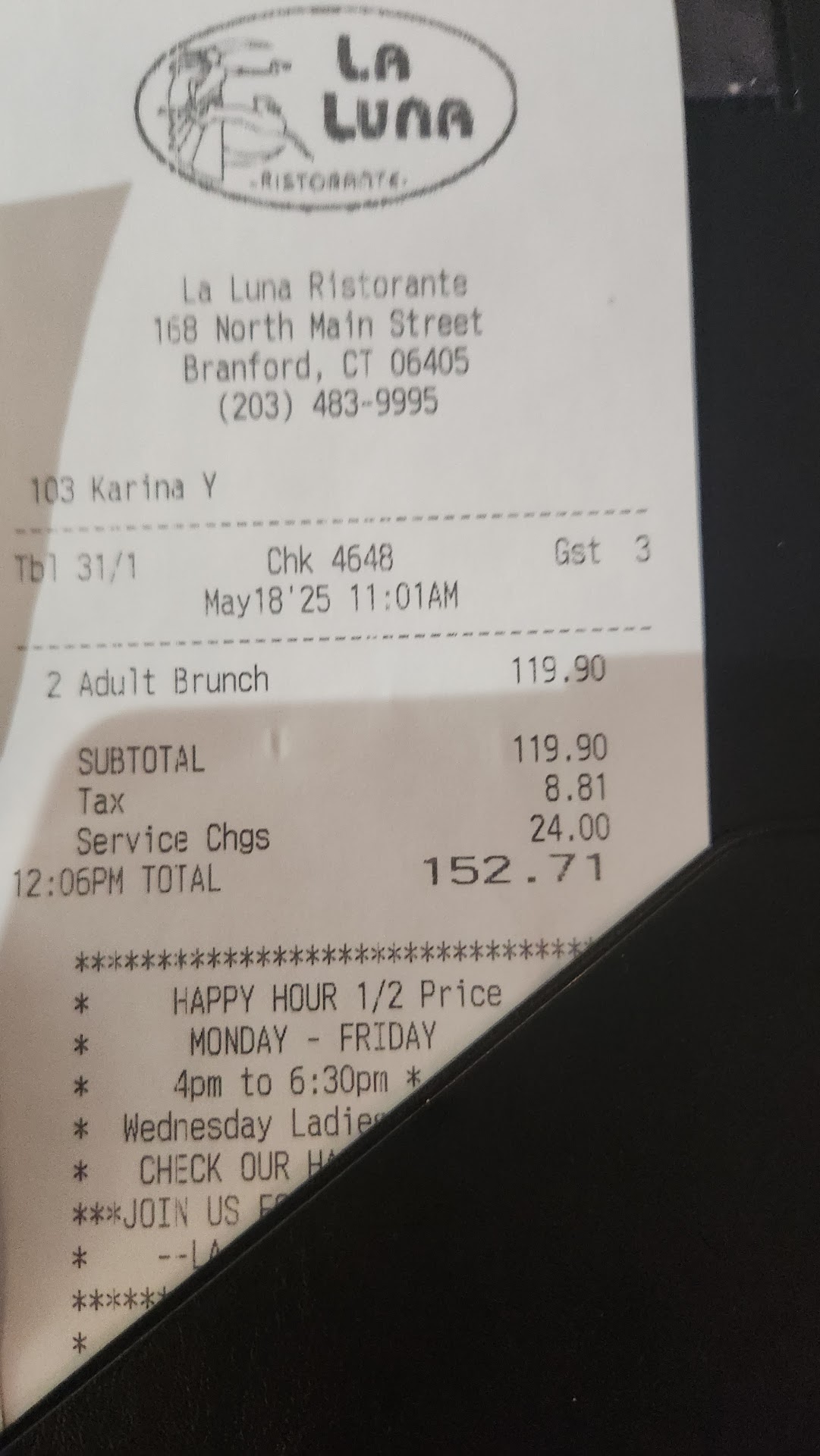 Read moreGoogled 'restaurants near me" off 95 S in Bradford CT because we were starving. We had apparently missed the coastal restaurants and didn't feel like backtracking. LaLuna I was rated 4.3 stars. Hmmm! It is more of a function / event venue than restaurant. We had to hunt a waitress down, then we're seated in a whacky white room with corny Christmas decorations and laser generated flashing lights in front of a large bar sandwiched between a baby shower and 50th anniversary party. Luncheon special provided 2 three-course meals for $35 and included individual choice of either beef minestrone soup or a house /garden salad (both delicious and accompanied by 6 garlic knot rolls.) Entree: mostly pasta dishes (ex. Linguine and clams; eggplant Parmesan over pasta: shrimp.scampi (+$4); salmon (+$6), etc. Dessert: strawberry or chocolate cake The waitress upsold me to include blackened shrimp on my linguine and clams. I regretted this due to a different taste profile,.and the shrimp was very dry. The linguine and clams in and of itself was fine (extremely salty and full of garlic) and clams were whole in the shells, but minced throughout. My husband's eggplant Parm was over squishy pasta and watery sauce that tastes like unflavored hunts sauce from a can. Cake was surely leftover function cake, but delicious.