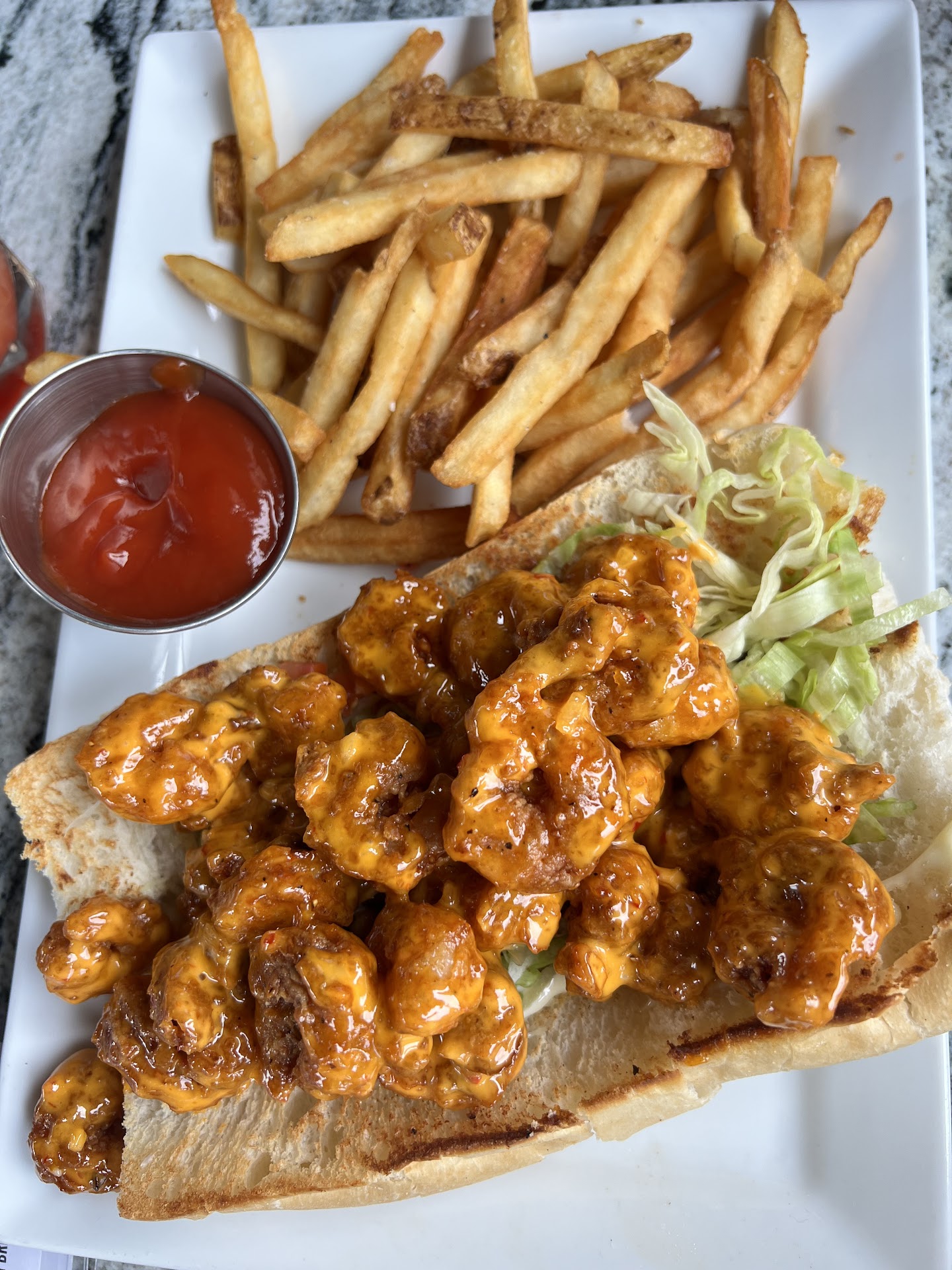 Our experience here was not the best, and we came here to unwind after a long days work. The hostesses were kind and they allowed us to make our way to the bar. However, when we got to the bar to sit down, it was a different story, and should have followed instinct and left. Our bartender was straight up rude to us, no emotion on her face, no greeting. We were polite to her, but felt like we didn't belong there. We ordered a couple of bottles and one on tap. We ordered dinner as well, the chicken fried steak and the shrimp poboy. The food tasted good, the sweet potato fries were really good. They were so delicious that I could never imagine why they would serve them with ketchup. The waitress who brought out our food was very nice, I asked her if they had a marshmallow dipping sauce for the sweet potato fries ($2 extra charge for the sweet potato fries per menu ), she said they didn't but they did have a caramel sauce. I asked her if she could bring one out. So I waited, the bar tender was giving me the eye when she asks how things were tasting, which mind you I'm waiting on the sauce(haven't touched dinner), so why ask how things are tasting when she knows the answer? I told her that I was waiting on the sauce for the sweet potato fries. Charged extra for sauce, which is understandable, the caramel sauce was delicious it had chili flakes in it and paired so much better than ketchup would have, except what really sucks was her response she had when I had inquired that the couple who had ordered what looked like sweet potato fries also had a caramel sauce with the order. Her response: they ordered the apple fries. Ohhhh ok. Nice to know. How about letting us know that you are gonna slip that extra charge for the caramel sauce on our bill? It would have been nice at the least. She had a piss poor attitude with us and flirted with different waiters that came up to grab drinks, at least she smiled at them. Unprofessional.