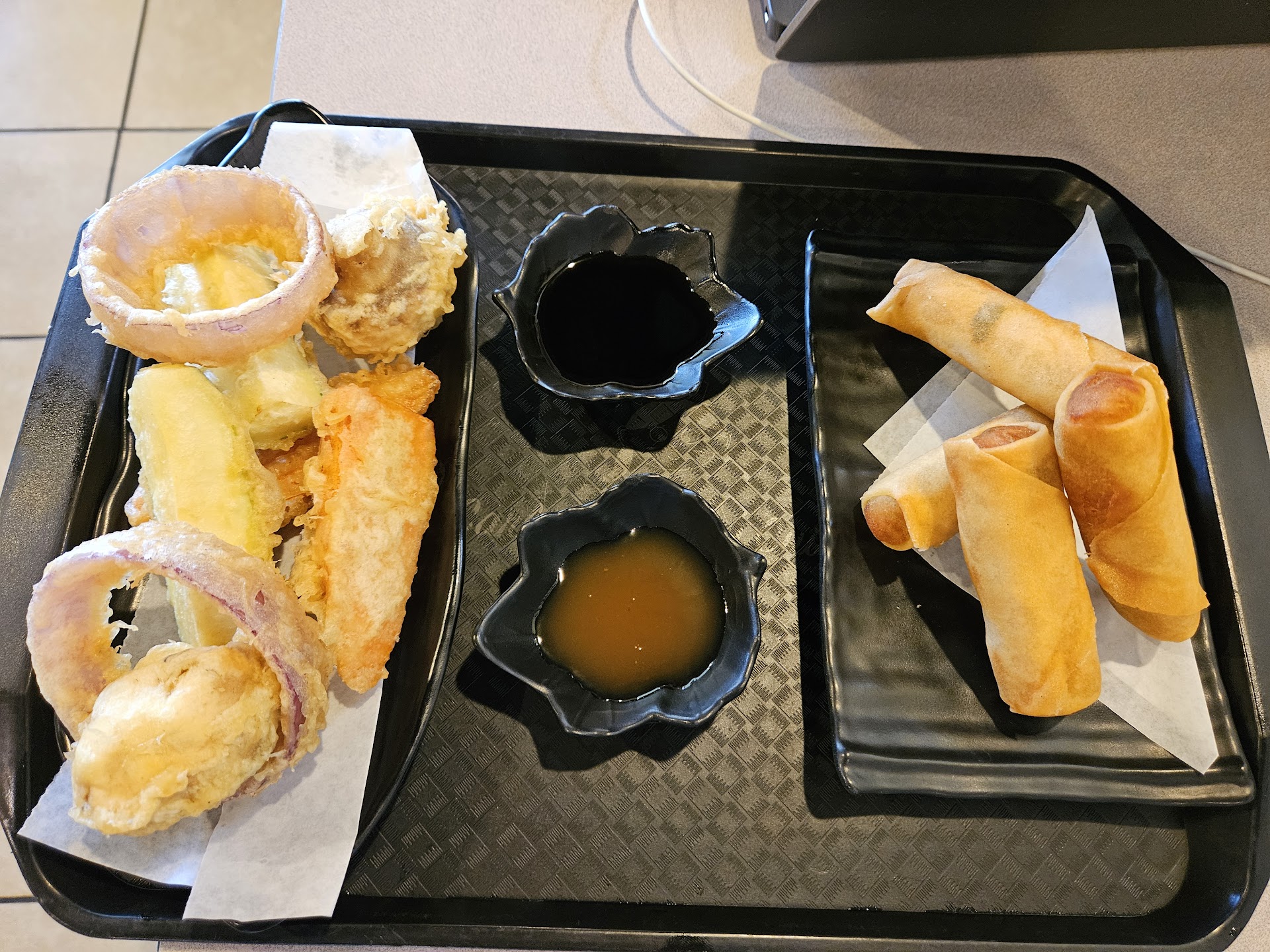 Our order included Stir Fry Noodles with mushrooms and a shredded chicken leg with an Iced Lemonade. Also, the Fish Sandwich with homemade potato chips and a side salad with vinegarette dressing and a Honey Papaya Iced Tea. The fish sandwich was a huge piece of Cod fried light and flakey with a homemade tarter sauce and a spicy house sauce. The bun was light and fluffy with a slight crisp 😋