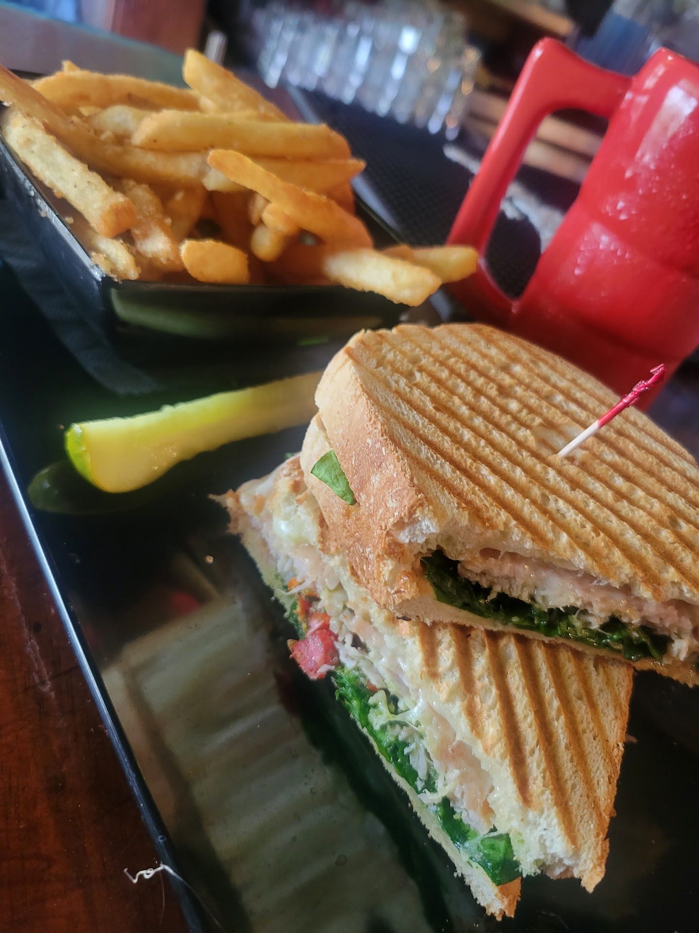 Read moreGot there, we were standing at the doorway because we had no idea if it was a "seat yourself" or "wait to be seated" deal. Eventually someone said from across the room to sit anywhere. We started going up the stairs and were told not to go up there as we already made it up. We got a booth by the bar that still had dirty dishes on it, (all the empty tables had dirty dishes on them) and there wasn't enough room for all of us so we had to pull up a tall chair. Sat down and didn't get a drink order put in for about 10 minutes. After we got drinks, they took our food order (5 in group). We made it through our drinks, the waitress and bar person walked by multiple times and didn't offer refills, check on us, or let us know a food update. We asked for a refill and got no verbal response to it, almost seemed like we were bothering them for asking. After waiting an hour, we noticed two tables, who came in AFTER us, get their food. We were a bit upset, and upon asking, we were told it was coming soon. We waited another 10 minutes and decided to walk out because it had been over an hour, no one updated us unless we asked, and we were very hungry. Then as two of us made it to the door, the waitress stopped the rest of the group at the booth and said it would be 5 minutes. We sat back down and the food did come in about 5 minutes, BUT, they put Jalapeños on our nachos when it was not supposed to be there and put no beef on our "beef" nachos. The other food was alright, but my meal was forgotten and we were too upset to ask about it, plus we didn’t wanna wait another hour for a panini. I ended up sharing "beef" nachos with my S/O. No one checked on us while we ate, but the waitress was quick to pick up one dish from our table without saying anything. We had to ask for the bill when it was clear that we were done eating. We told them about the missing item and they took it off our bill. The whole time it seemed like the waitress and bar person were checking on everyone but us. It was not a good experience at all. We are from Kansas so we had a long drive ahead, and having to wait that long really put us getting home late. I'm upset that a quick lunch turned into an almost...