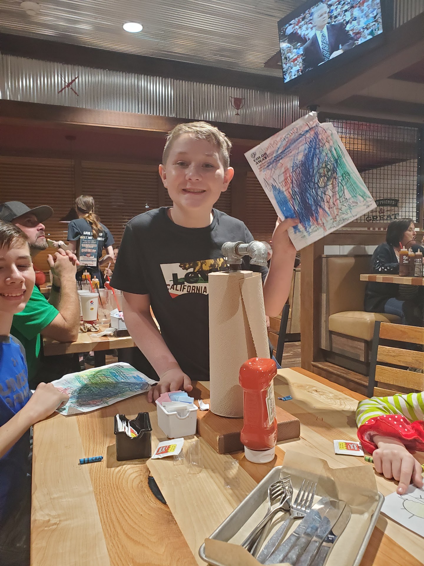 We decided to just get a to go order.. my son got chicken strip with Fries and cheese curd app... $10 for curds, MAYBE 10 curds in box!!! 3 Chicken strips and a tiny handful of fries.
