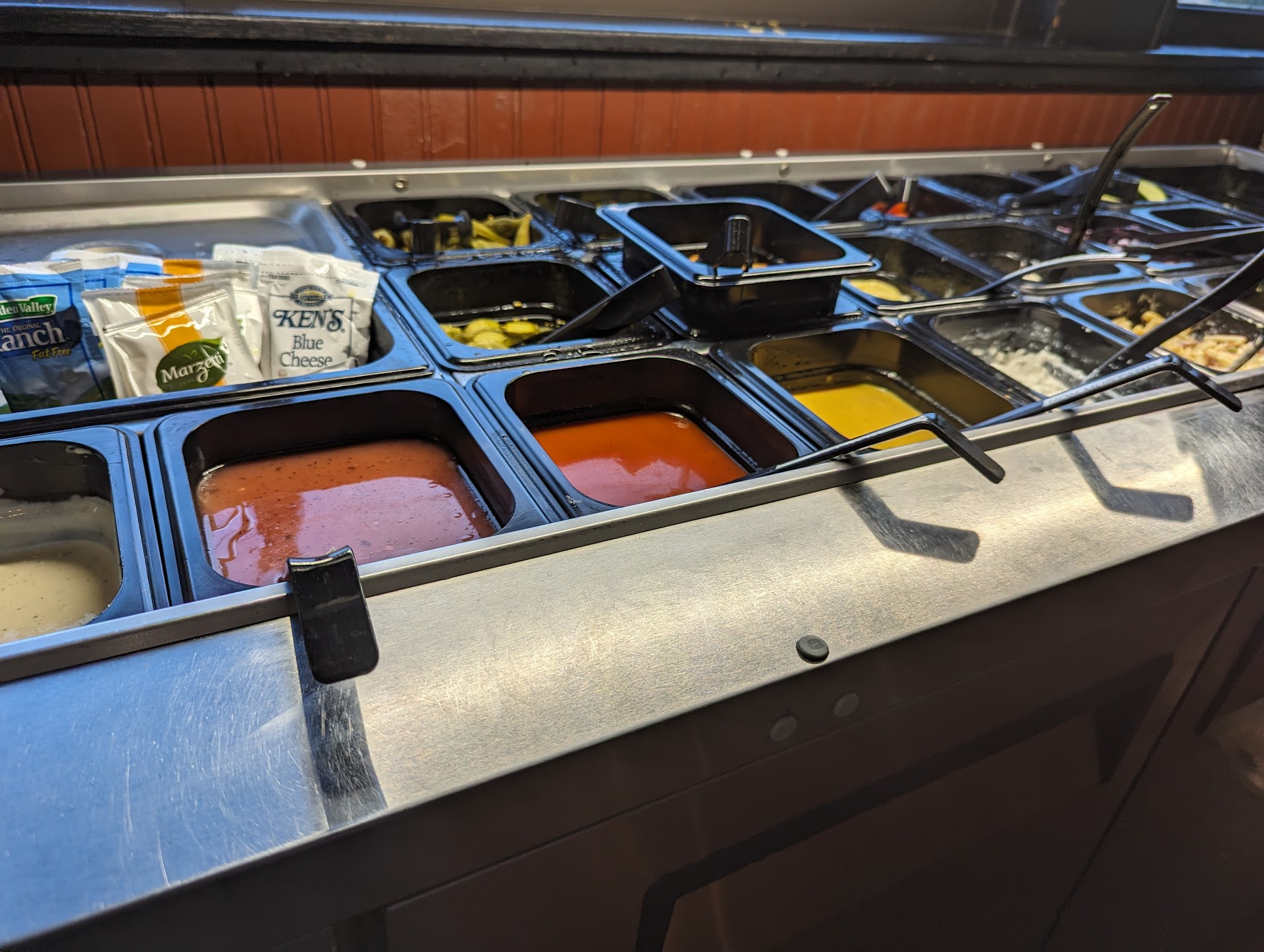 Regarding food, it is what you would expect for a pizza buffet--pizza galore, salad bar, dessert pizzas--and then some. They also carry mash potatoes, gravy, assorted steamed vegetables (not the salad bar type of veg's) and FRIED CHICKEN.