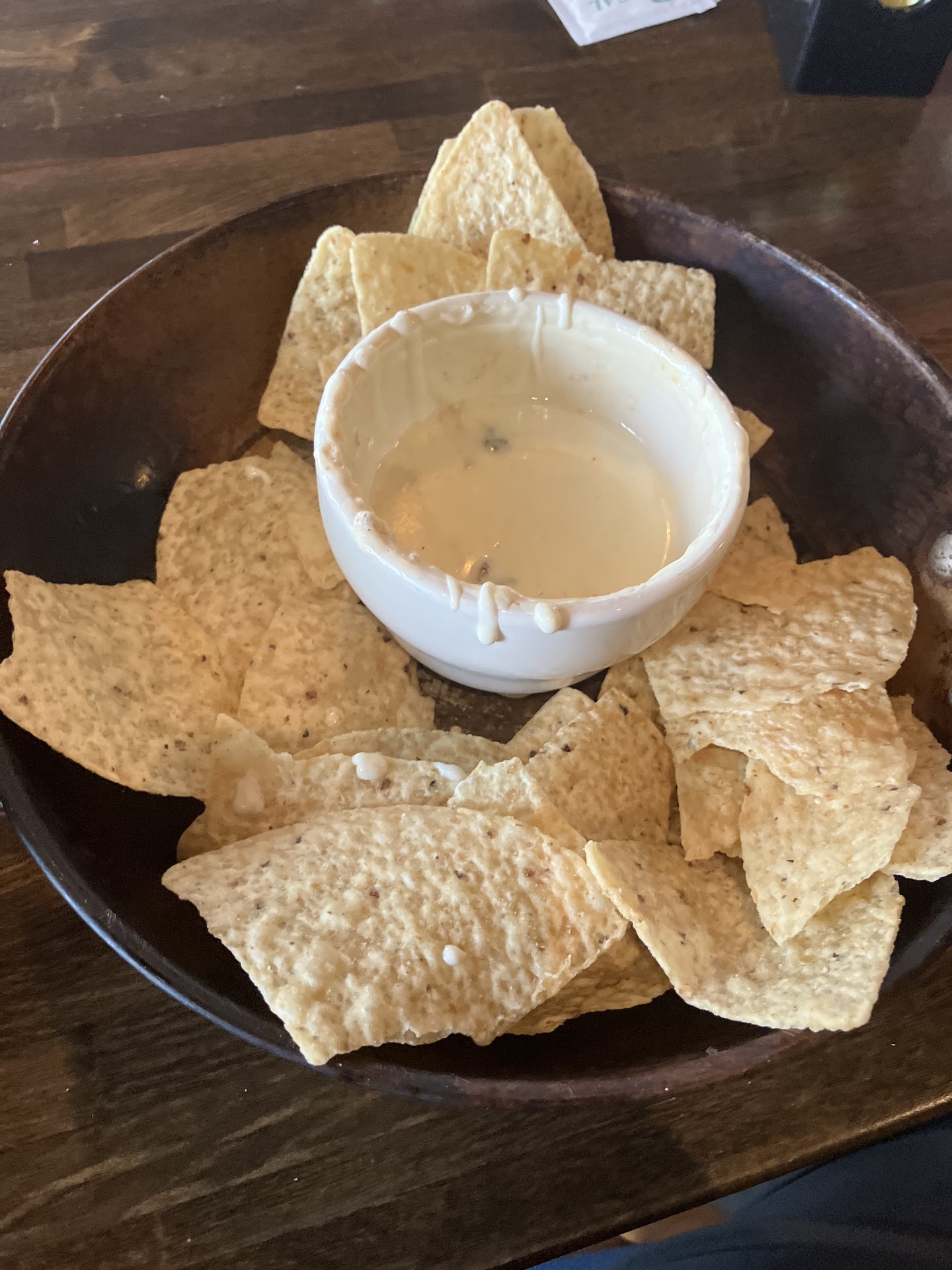 We started with queso and chips. The queso was actually very good—nice spice and homemade flavor—but the chips were mostly crumbs, like the bottom of the bag. Strike one.