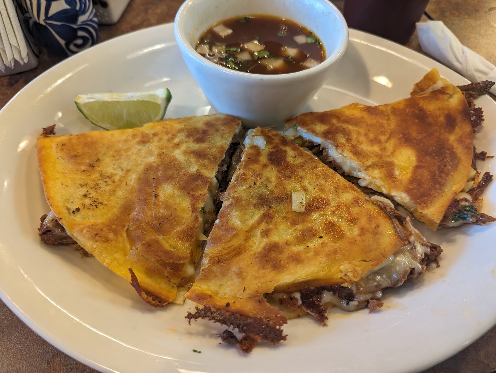 I ordered the Birria Quesadilla. If you've never had Birria, think of it as a tasty broth to dip your quesadilla/tacos in. They were on par with expectations, but nothing special aside from being a Birria Quesadilla.