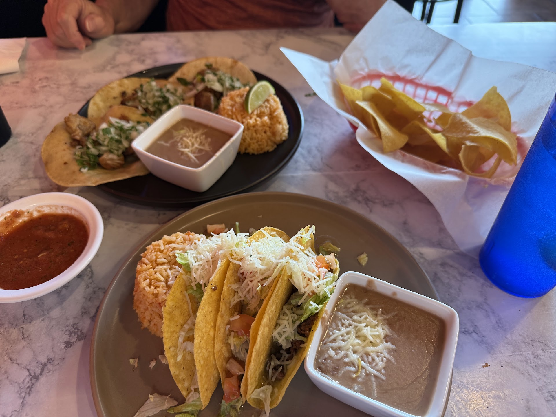 My wife had 3 beef tacos and I ordered the carnitas tacos, both with beans and rice. She thought the presentation was nice and the beef very good. The shells were not tough. The food was served at the proper temperature.