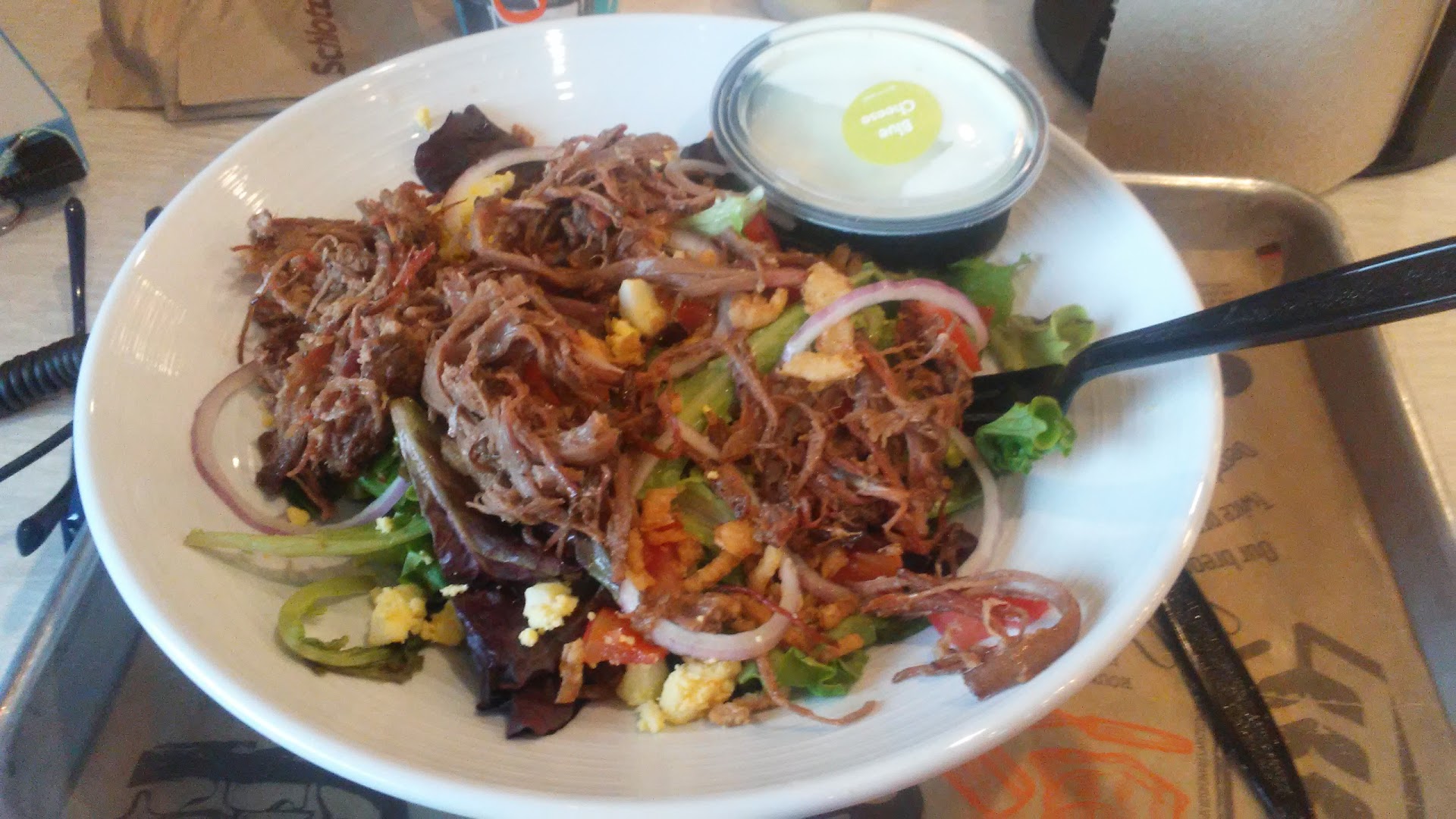 I ordered the brisket n bleu salad and it was terrific. Loaded with spring greens, red onions, hard boiled eggs, tomatoes, and romaine lettuce topped with bleu cheese dressing and shredded beef brisket. They have many other salad dressing choices, but the bleu cheese dressing is just the right amount and compliments it.