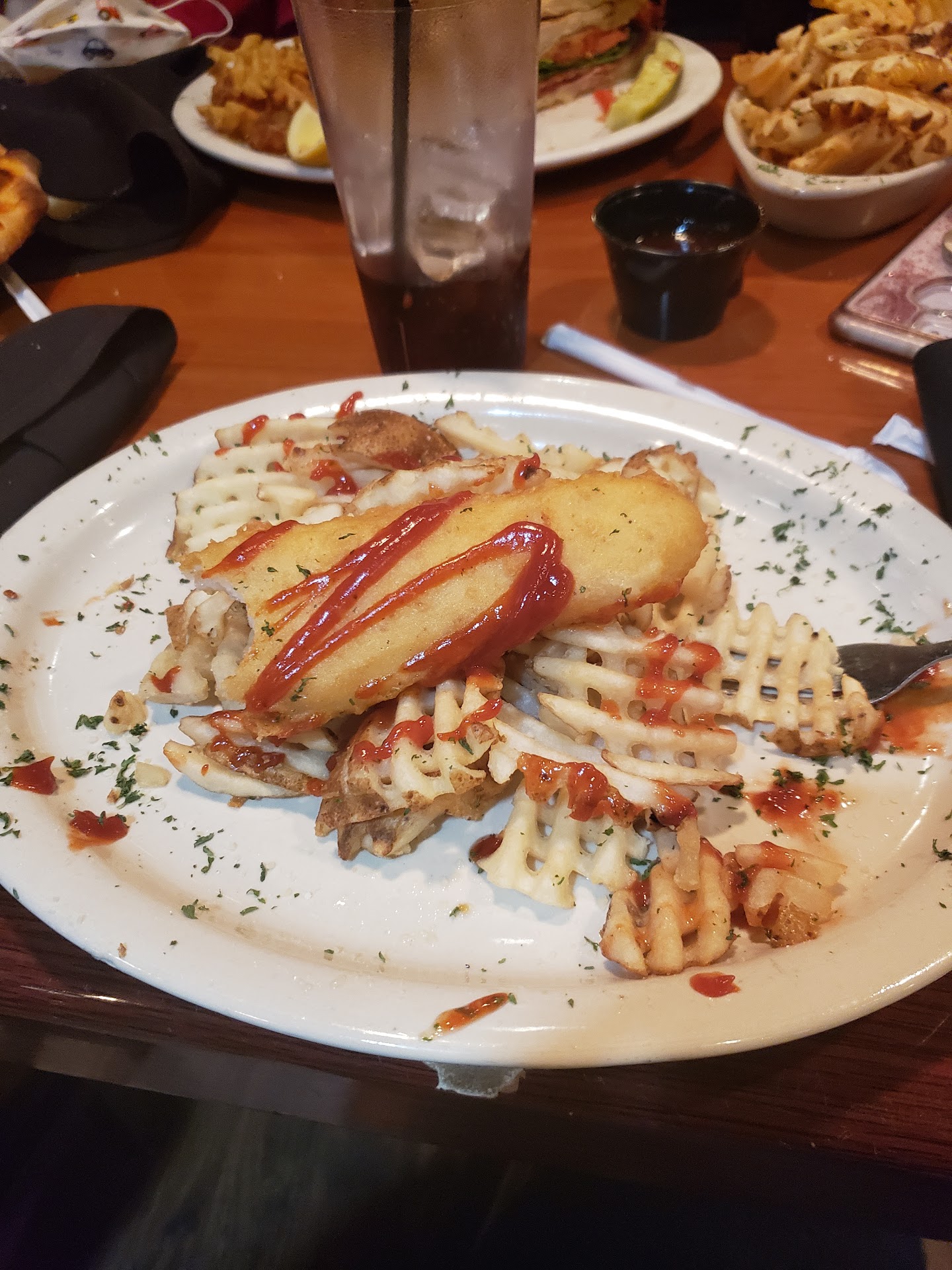 Read moreStopped in with a family of 5 (2 adults and 3 kids) upon bringing us our drinks the waitress (Felixia) told us "Oh, I think I'm burning your bread" then brought us the burnt bread and asked if it was ok "Some people like it like this" and offered to bring us another. We politely declined and she brought us another after we finished that one anyway (totally fine and appreciated). My date ordered a Broadway club which turned out to be a huge, delicious looking sandwich. The kids menu said "Kids Pizza" so we asked for pepperoni. I ordered the Fish and Chips, the 10 oz of Haddok and waffle fries sounded delicious. When we recieved our food the kids pizza was the greasiest thing I'd ever seen aside from the bread, my partners sandwich was great but her fries were so overdone they snapped like twigs, and my two pieces of fish were obviously the breaded fish filets you can buy at Walmart in the frozen food section (see attached photo). I asked why the fish didn't look like the ones in the picture and was told at first that I was looking at shrimp, then was told by the manager that it was the chicken fingers and that "The chicken is made in house and very delicious" When we finally recieved the check after rude and spotty service we were charges for an extra drink, told that the pepperoni pizzas had an upcharge, and the barbecue sauce was extra, he childrens drinks were the same price as the adult drinks, and we were struggling the find a way to pay the bill that was $20 more than expected. I finally had someone Zelle me the money to cover the tab and couldn't afford a tip (not that I would have left one after the awfle experience the waitress gave us) I was followed outside the restaurant by the waitress who was cussing and screaming at us as we tried to leave. I am beyond appalled at the service, the quality of the food, and the hidden prices on everything. I will never be back and I hope this place gets a real overhaul on staff and product. They desperately need it. The fish in the...