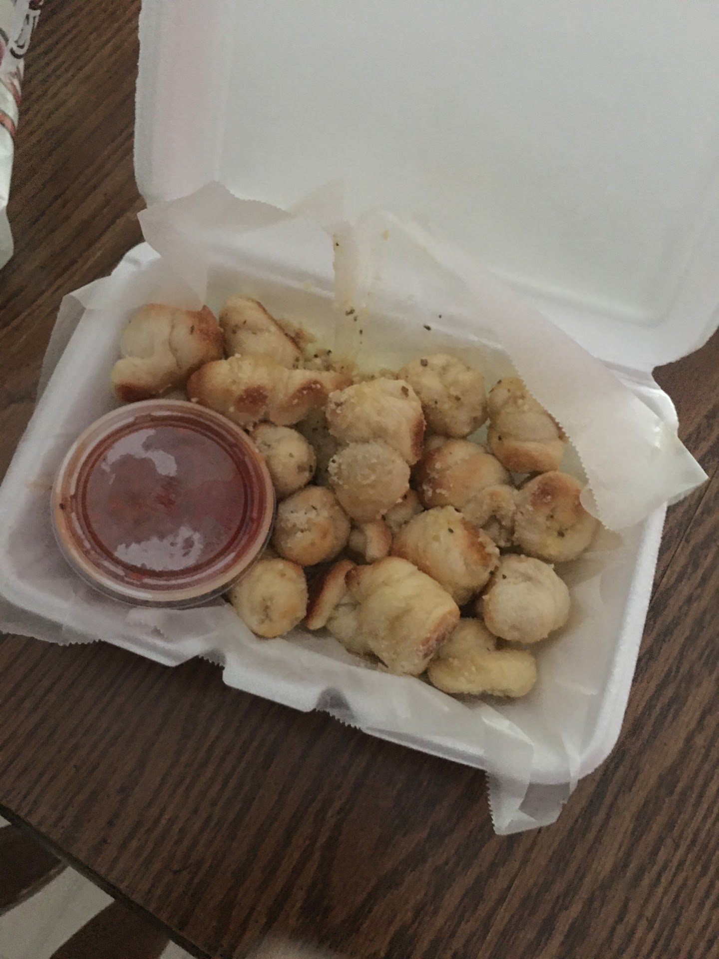 This is another review in my journey for the perfect calzone. I am doing it for Johnny’s. When I used to live in Flowery Branch, the calzones were one of the best I ever had. However, it has been a while since I visited this location and unfortunately it is not the same since I last visited. First previously the calzones were large. At least 12 in. In fact they previously had a 16-18 inch version as well. Now it is only about 8in which is disappointing since this is usually not satisfying. In taste the dough had a slight salty taste, which was unexpected. But the flavor of garlic, ricotta, and mozzarella were balanced well and were delicious. In appearance, the calzone was slightly droopy and there was an area that was slightly overcooked. Overall the calzone was good, but not the best I have had. To help complement the calzone I had garlic knots which were excellent. Perfect Garlic, Parmesan, oil mix. Also the sauce they provided for dip was a perfect balance of sweet and savory. A friend that went with me, had a gluten veggie pizza and garlic cheese bread. He loved it. I will most likely not visit this location due to where I currently live but would go back if I lived in the area. I would not have the calzone again due to its size...