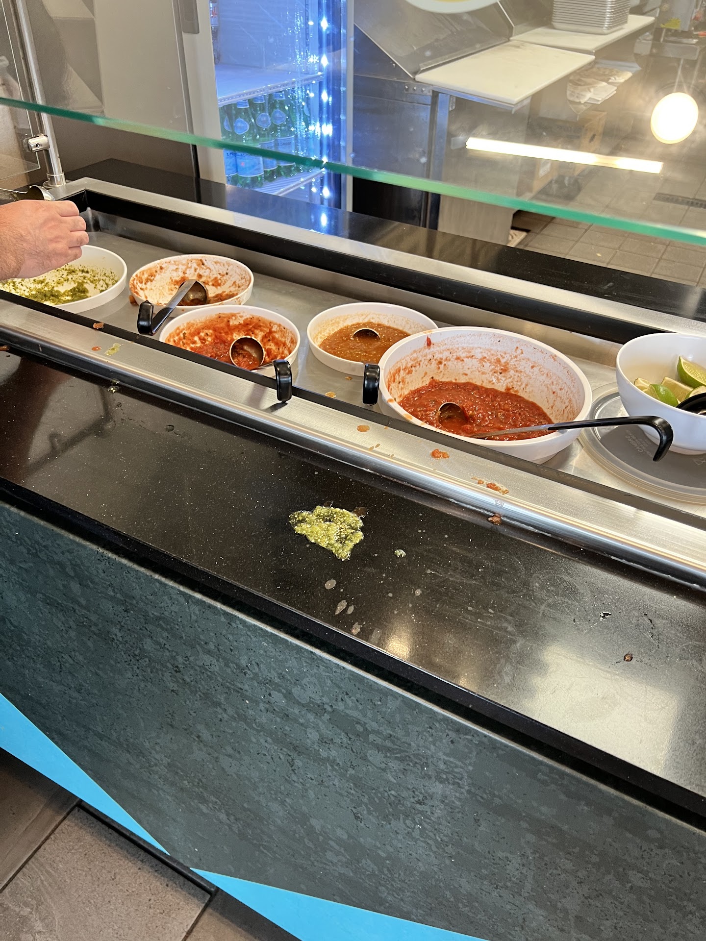 Secondly, the store was a mess and not trashed but not up to par. The salsa bowls were bare except some old scraps just lying in there and I had to ask one lady if she could refill it and she did after a little bit. The drink machine was the worst as it was covered in old drink syrup splashed all over.