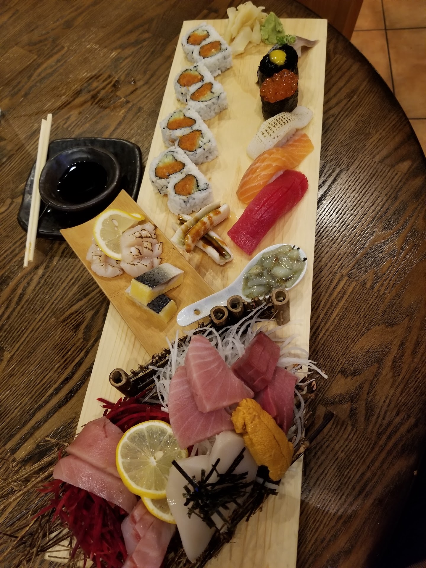 first waiter that seated me was nice and super helpful. just ordered the basic sushi combo. miso soup came out quickly. out of balance. little dashi flavour, only salt from miso paste. was this just instant packets? there was wakame but not tofu, only slices of regular brown mushrooms not marinated or cooked. not a good taste. oh gosh i hope they weren't old white mushrooms that had just dried up. the sushi came out after about 20 minutes. asked for a dish for the soy sauce. waiter glanced at me rather annoyed. he gestured at the plastic takeout condiment cup sitting on the table and said "busy night, that's all we got". $20 for 6 pieces nigiri and california roll and all i get is a take out plastic cup? can't even dip sushi into it, too small. he came back by a little later with a metal dish. hmm no thanks. fish was not so good. bland, not good texture, too cold. scallop was actually a bit bitter in taste. the rice was plain? couldn't taste any vinegar. california roll was pretty harmless but it's kind of tough to mess that up. really could do just the same at the deli counter in the grocery store. if manager reads this... really sorry but i wanted...