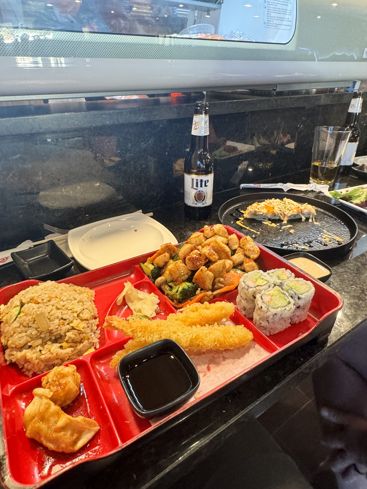 The ingredients in the salad (included in the 2 meals) and sushi are so fresh and you can taste that! I got "plain noodles" as my side for the bento box and PLAIN is SOOOOOO not the word for those noodles they burst with flavor. The pork dumpling wasn't super greasy. The tonkatsu wasn't muscley or doused in grease. My husband's hibachi had an amazingly stellar amount of scallops considering he gets them from our previous go to hibachi place in buford and he would only get like 5 scallops in the same exact meal. The dressing for the salads is made fresh and you can tell. The soups are so flavorful and have a nice texture.