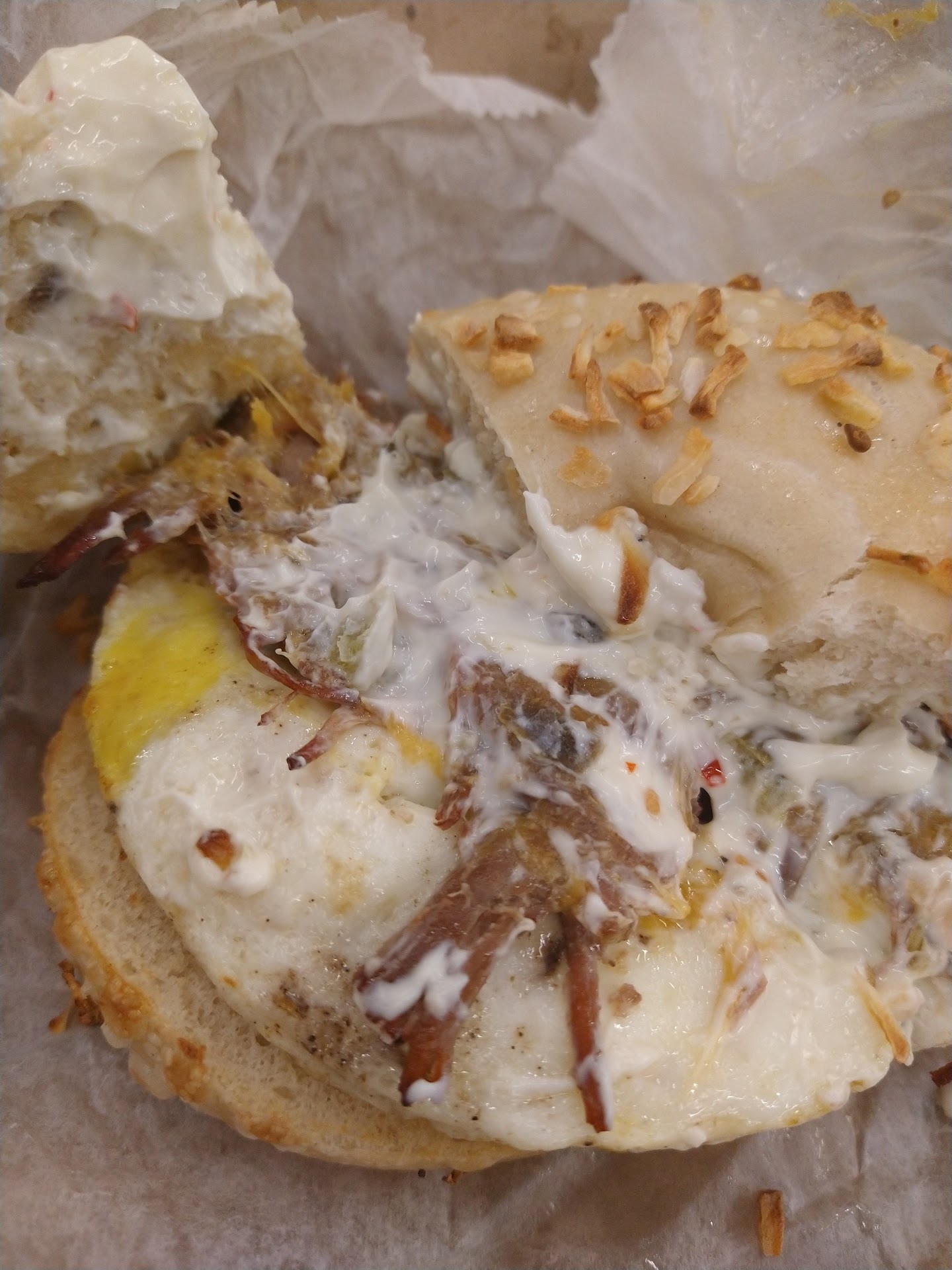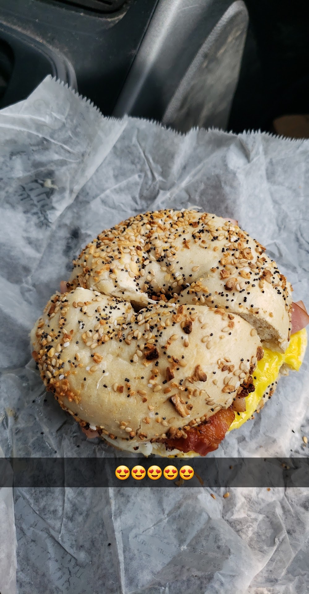 I went there in person. The bagel was better, but I had the smokehouse western brisket with two eggs. The brisket was ok from what I was able to taste. It was drowned in cream cheese and the eggs had way too much pepper on them, blackened with pepper and tasted like they were steamed. Watery eggs. Unedible. I almost asked for a refund but I just tossed it.