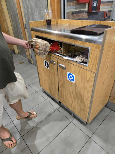 A giant puddle by the men's toilet that made it almost impossible to use (1/3 of the stall area) A french fry covered in ants just lying casually on the floor A table covered in coffee and trash with a mop just chilling next to it Trash on the tables and all over the floor. We couldn't find a table that was clean. Overflowing trash in the main area, the ladies' room, and the men's room. The men's room had underwear laying on top of the trash - not their fault per se, but pretty gross The people at the registers ignored us for about 10 minutes as they panicked over a payment issue with some doordasher that didn't pay or something, right in front of the customers while they waited. We got apple packets in a happy meal that had some sort of funky gel coating all over them and were expired. We also got an extra free cheeseburger, so yay?
