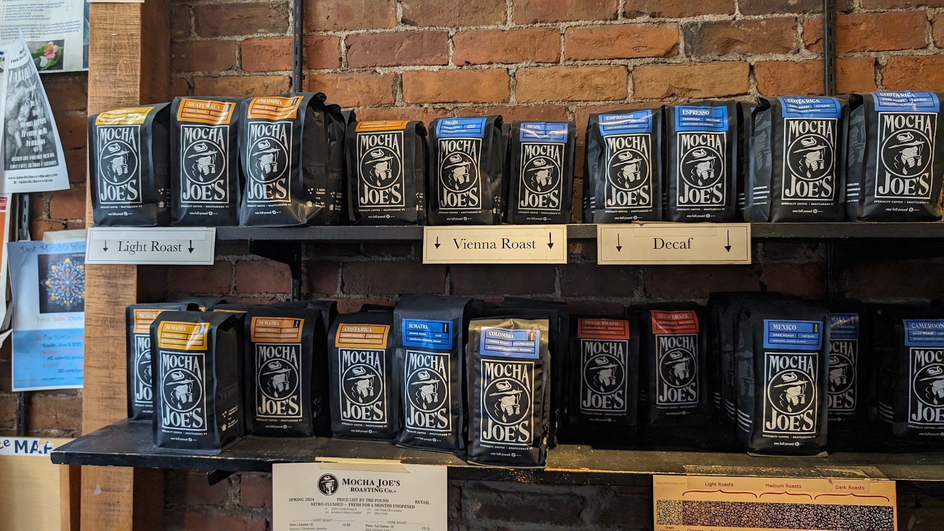 Mocha Joe's also has a particularly nice selection of bulk coffee in whole bean form, which can be ground to one's liking. The beans are a variety of fair trade, equal exchange, and other things great for the coffee farmers and the environment. They even have a certificate from a provincial (?) government related to coffee agriculture.