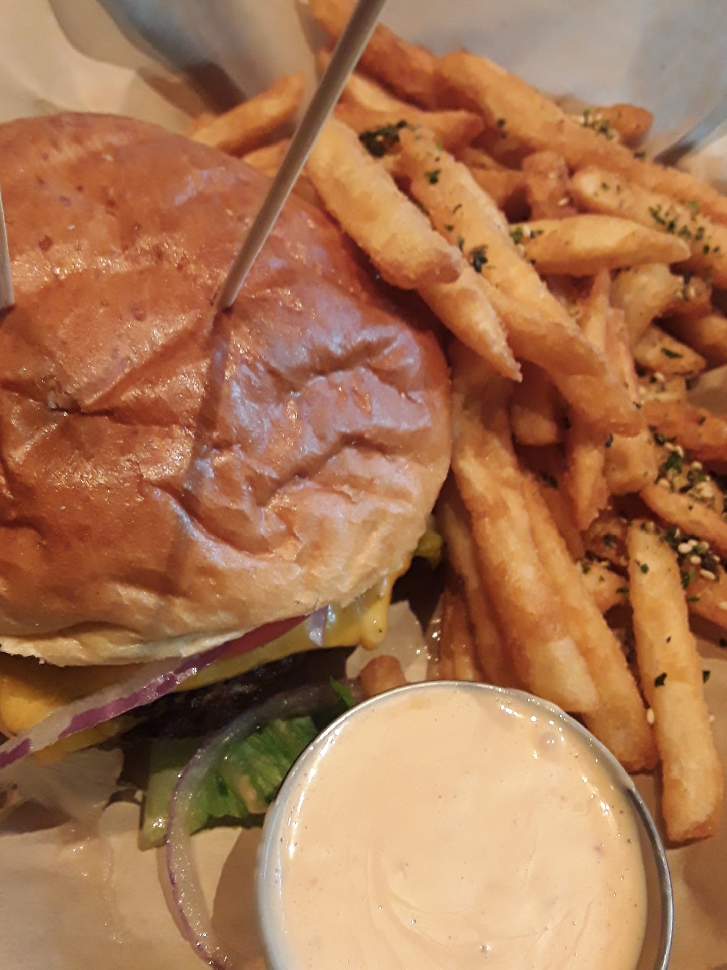Read moreFour of us arrived at 5:30 pm, the Friday of Christmas weekend. Although finding parking was a challenge, the restaurant itself was not that busy. The front desk staff was very friendly. There was a minimal wait to be seated. Most of the restaurant is wide open space with tables, a high ceiling, and a hard surface floor. I find this to be too noisy and not relaxing at all. There is also outside patio seating with heaters so you can bring your dog. I prefer inside where it is warmer. Luckily, they also have a more contained area with booth seating. I really appreciate this effort to cater to different people's seating preferences. We got a great booth against the wall and were waited on immediately. This is not the place to go if you are looking for a lot of healthy options. Two of us opted for different hamburgers with half pound patties that came with your choice of one side. My husband got fish and chips that came with seasoned fries and a side of Cole Slaw, and the other (vegetarian) got a stir fry with tofu. All were well prepared and delivered to our table quickly and hot. The food itself and prices were average for similar types of restaurants. Highlights and recommendations are the garlic edamame appetizer and the seasoned French fries. I was disappointed that I chose fresh fruit as my side and just got a small piece of watermelon, but it was tasty considering it was out of season. My generous husband shared some of his seasoned fries, which were excellent. Next time, I will just give up the illusion if trying to be good and get the seasoned fries myself. They brought this electronic thing to the table for us to pay ourselves. I am not a big fan of the new trend of having customers do what employees used to do, but it seems this is happening in more and more places in an effort to save money and time. I know that there are some customers who actually prefer...