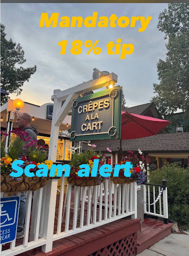 Read moreThe crepes are fine. Worth the $12 or so they charge for a basic crepe. The issue with this establishment is their automated kiosk where you order. Others have complained about the double tip and the mandatory 18% on its own. Let me explain it to the owner who quoted it was state law to charge an 18% tip. We’ve all eaten at other places. Perhaps there is some employer minimum wage he has to pay but other restaurants are including this cost of doing business in the price. No one else on Main Street is charging a separate line item for a state required 18% gratuity. The second issue is the one that brought me here. The computer screens are tricky. When you get to the end of ordering and you see tip for the second time, you assume you are getting a chance to re-affirm the 18% or change it. Nowhere did I see the words additional tip. Now if on this kiosk there were disclosures, they need to be made more obvious. I didn’t see them. Next time I’m in town, I’ll record myself completing a transaction to see how the presentation looks. You have a good product. No reason to mess it up by making people feel ripped off. I didn’t like my total going up and realizing I double tipped but I thought it was probably going to the employees so Oh Well. So why am I here? I visited a different Crepes location in Silverthorne and that location does not include an 18% tip. It’s pretty straight forward. The Silverthorne location is not the tourist trap that Main Street is so perhaps he or she knows they can’t get away with it there. I’ll post the video soon so people know what to expect and don’t feel ripped off...