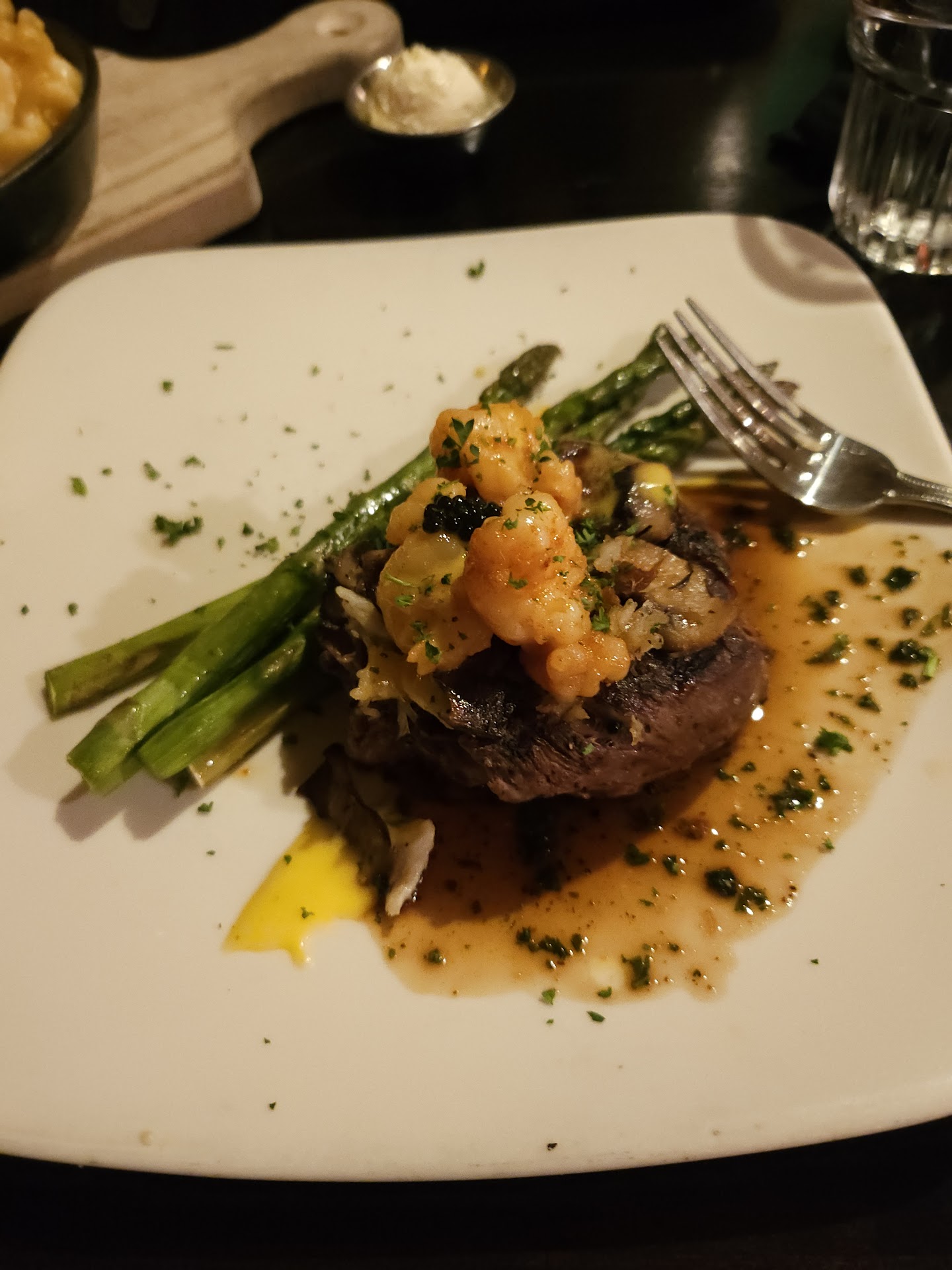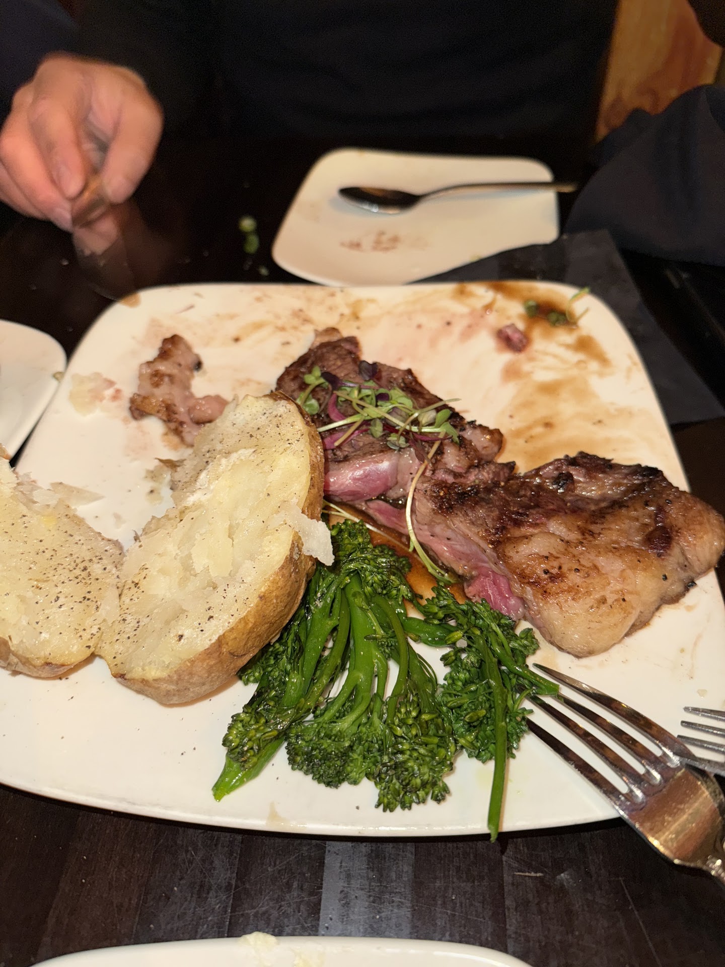 I ordered the ribeye with a baked potato as my entree. Steak was good, but desperately needed salt. The baked potato was dry and overcooked and not enough toppings came with it. I got a thimble full of sour cream and butter, a tiny amount of cheese that looked like it came from a bag of pre-shredded from the grocery store, and the bacon appeared to be pre-made from a jar as well. No one came to check on us until long after the food arrived, so rather than wait to get additional toppings, we just ate it as is and left immediately. Had our experience been better, we would have easily doubled the amount we ultimately spent on our dinner and bar tab.