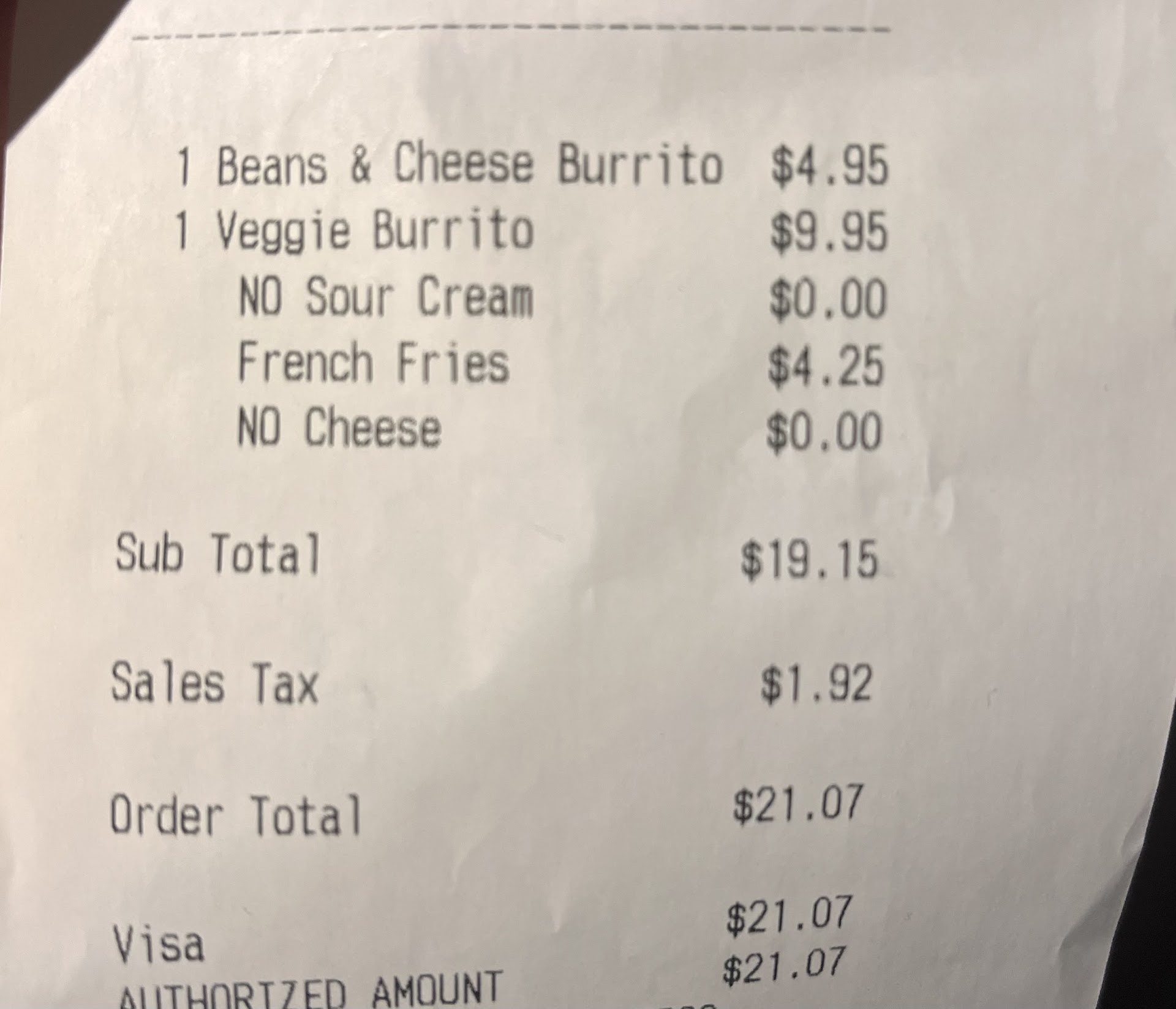 What a got A cali burrito. Not much meat loaded with cheese and pico and very little amount of soggy fries. And not a drop of sourcream. No fish taco. 4 asada tacos.. wow they got that right And 2 shredded chicken tacos.. The dude who took my call clearly just didn't care and def rushed me off the phone. But I've always called in ahead of time and never had a single issue. Make sure you triple check...