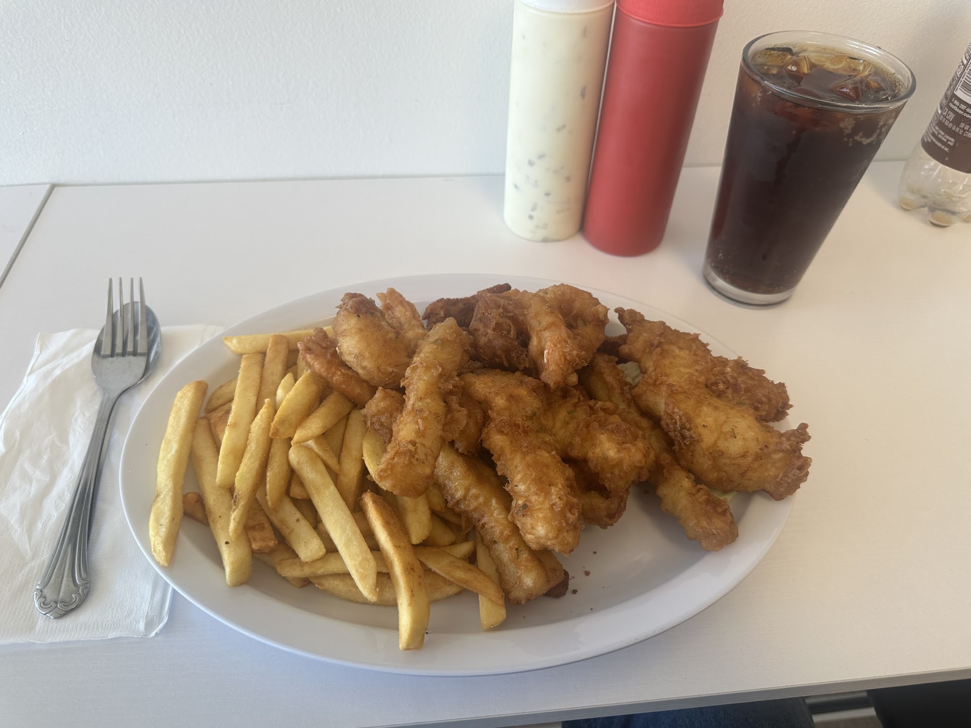 My fish and shrimp were cooked perfectly, both covered in a delicious beer batter. The fries weren't bad. They bring you a whole bottle of tartar sauce which I can appreciate. I was expecting much less here, especially after seeing how cheap, but I was totally pleasantly surprised. Is it the best fish and chips I've had? No, but is it awesome? Yes!