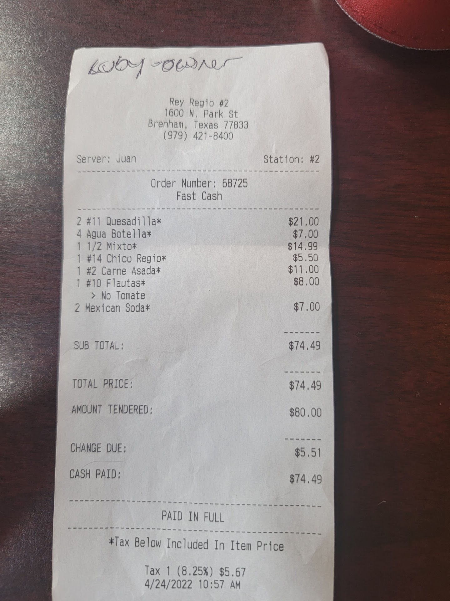 I HAVE NEVER BEEN TO AN ESTABLISHMENT AS RUDE AND LAZY NOT TO MENTION POOR QUALITY AND DIRTY AS REY REGIO #2 IN BRENHAM TEXAS