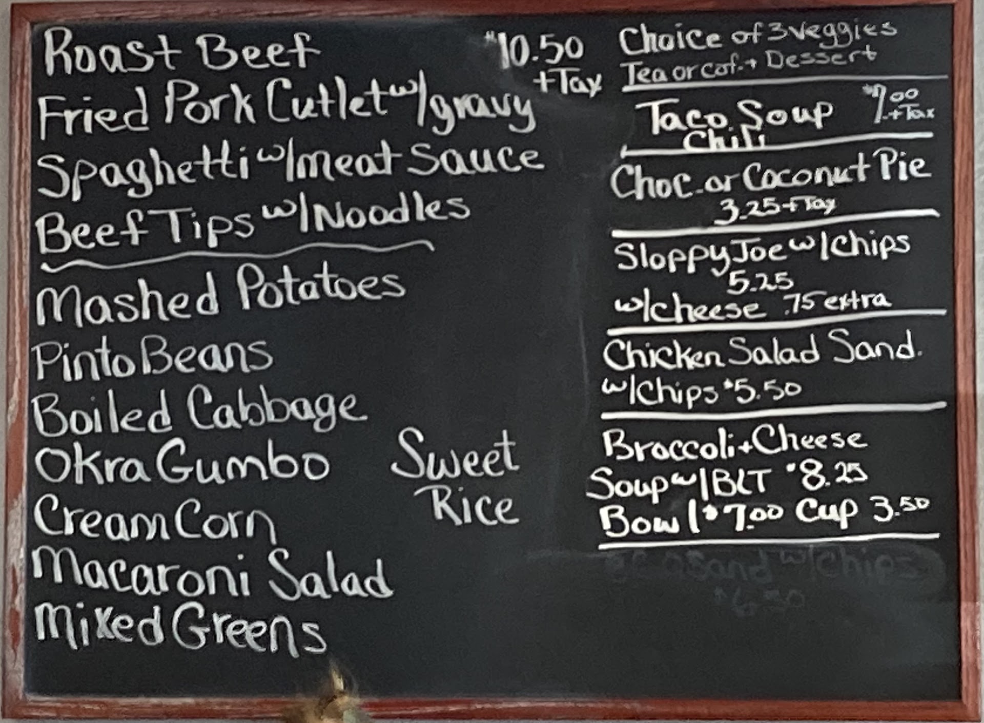 This place offers a daily lunch special which comes out in minutes. We ordered off the menu and was told they didn't have fried chicken because they used all their chicken for the baked chicken lunch special. I therefore ordered the fried pork chop from the menu because I wasn't interested in eating the overcooked vegetables I had seen other people eating. It came with french fries. I asked for them to be extra crispy and my husband ordered a patty melt with fries. We waited well over 20 minutes while an entire restaurant was served and when we had to hunt someone down to get our food we were told it was our fault because we ordered off the menu. To top this off the food was only ok and my french fries were not only limp they were raw. So bottom line get the lunch special and don't...