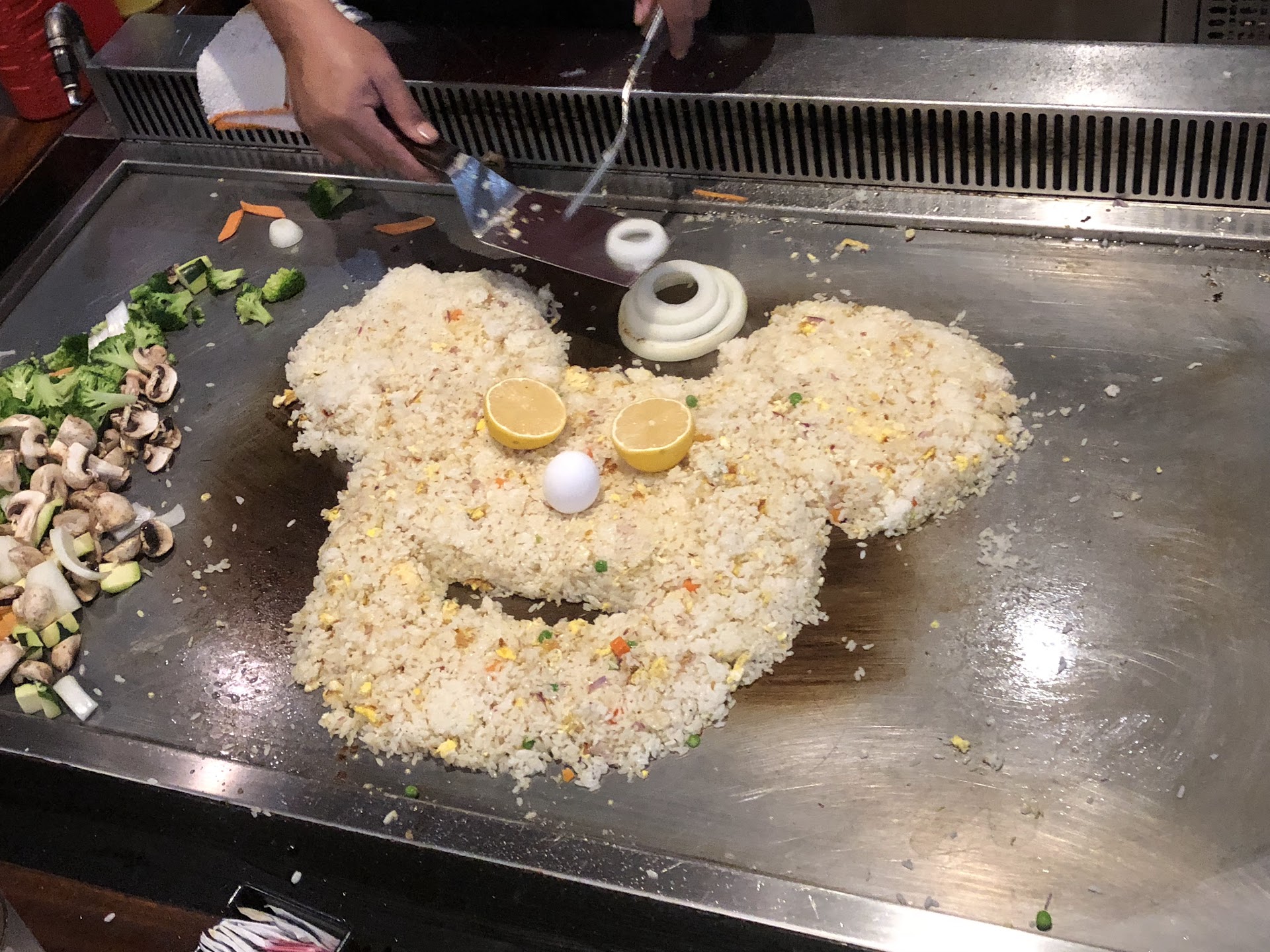 I absolutely love shogun and always have, however this location in specific puts a bad reputation on the shogun name and I was thoroughly disappointed by how long it took before they had a cook when the people we were sharing with were there before we even sat down, the salad and soup was delivered promptly with our drinks upon taking our orders finally however that was the only time my drink was filled until I finally happened to catch him again to ask for a new one 10 mins after my drink was completely empty. The sushi was still very good as usual, the rice was still very much so white even after I poured more soy sauce 3 times & my rice was crunchy??? We had ordered shrimp fried rice as we always have from shogun in the area we live in for over a decade now and they have never had an issue serving the shrimp fried rice all together as it should be; you recieve your shrimp WITH your rice, at the same time. This is not how they served our shrimp fried rice but 20 mins after we recieved the rice after its already eaten or now would be cold. My noodles were chewy, I'm presuming cooked aldente, because the chef had his little stove/grill on higher heat to have it cooked faster, my chicken was both burnt and chewy (ew salmonella...) the soup that is served with the ginger salad was off colored and tasted like dirty dish water, usually served with green onion i think instead was fried onion and frankly looked like it had crickets not onions in it, my mushrooms from my vegetables tasted expired completely turning me off from them. Simply overall an unpleasant visit as I could barely touch my expensive plate as it was rather inedible to which the waiter and chef rather than fixing the charge as correctly large fried rice with a side of shrimp rather than shrimp fried rice, didn't even ask for comps on anything regardless of the lack there of service in addition to subpar dishes and still wanted to give a horrible attitude. This is not the quality of food or service that I am accustomed to recieving from shogun....