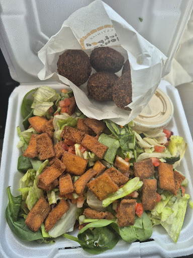 I have been eager to try Chickpea House, word of mouth has been really positive, so I was happy to finally give them a try. Just a note, they DO NOT accept cash. Apple pay, debit or credit is it. You order from the kiosks located at the front counter, its quick and easy. And with such a small menu you won't get confused by the choices. The gentleman that greeted me immediately handed me a sample falafel with hummus. The falafel was crisp on the outside and so well seasoned. I love hummus and their hummus was really good and creamy. I ordered the Chickpea Salad which was mixed greens, tomatoes, cucumbers and homemade croutons. It also came with 5 falafel and homemade pomegranate dressing. I also ordered french fries for the ride home.😜 The salad was fresh and delicious, those croutons are the best!! Yum! The falafel was good also. The dressing, not so much. Wendy's restaurant has a pomegranate dressing that is absolutely delicious so I had high hopes for Chickpea House's pomegranate. It needs a bit of sweetness, it's a little tangy. The french fries are hand cut and put me in the mind of In N Out's fries. These were thicker though and really delicious. Overall, I would definitely return. Hopefully they will offer some spicy options for us...