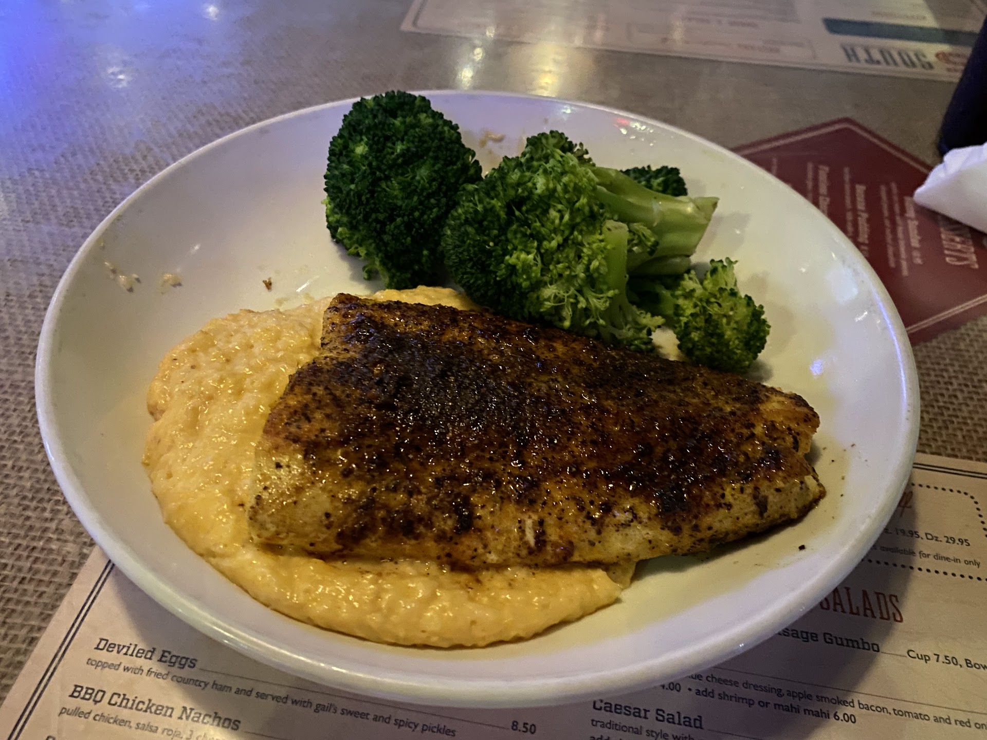 Everything was āCajunā and I donāt do peppers so I ordered the 55 South Mahi with cheese grits and broccoli for $17.00. The item description said grilled and it was blackened. I specifically checked that it said GRILLED. They didnāt qualify that 55 indicated it was smothered in a mixture of spices mostly PEPPER. I couldnāt eat it as I have a capsaicin allergy and my lips started to swell after two bites.