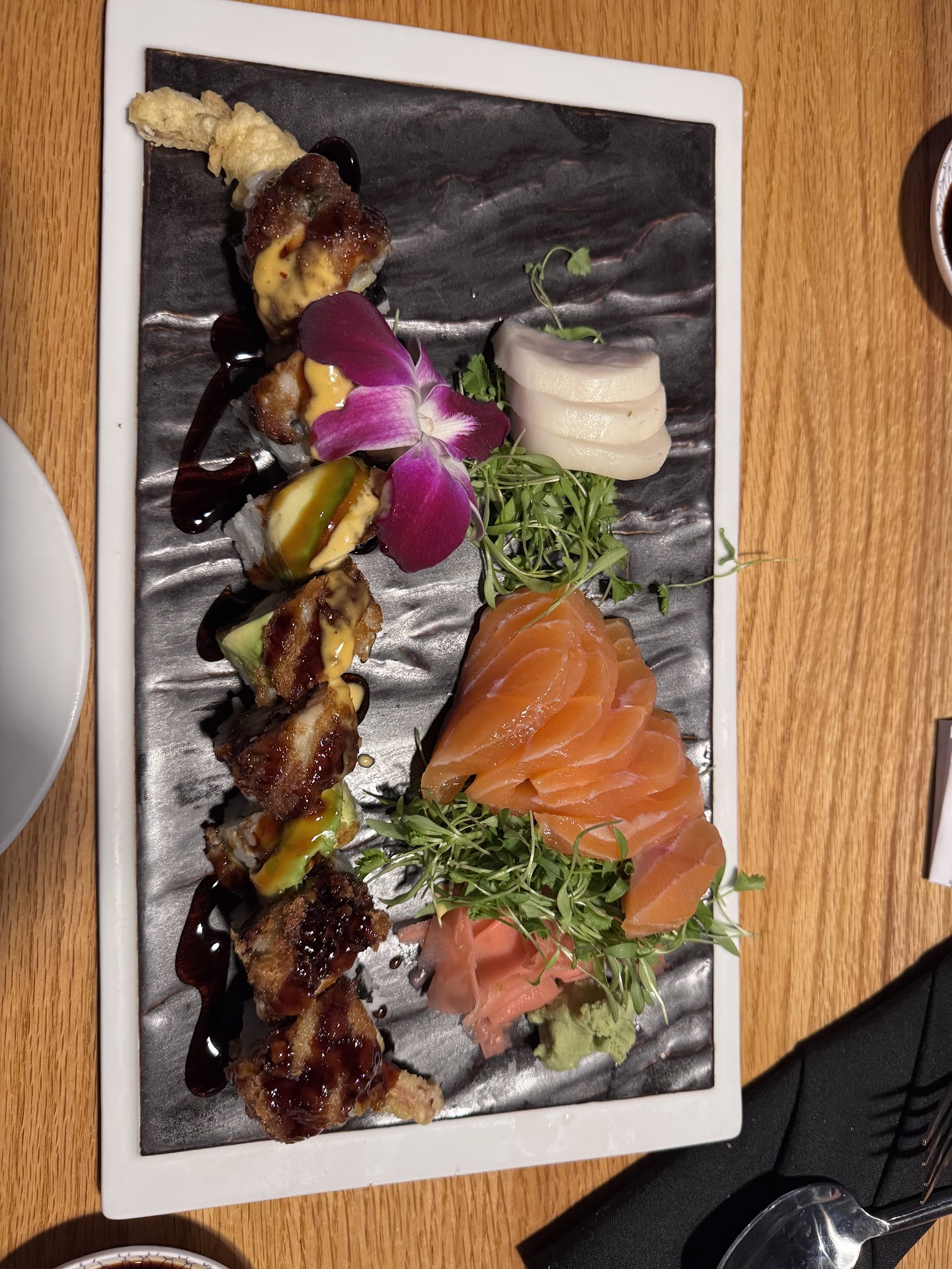 The young man who took our order misunderstood it, resulting in delays. Most concerning, the sushi itself was not fresh. It was served at room temperature, had a plastic look and texture, and was inedible. We were genuinely afraid to eat it for fear of food poisoning.