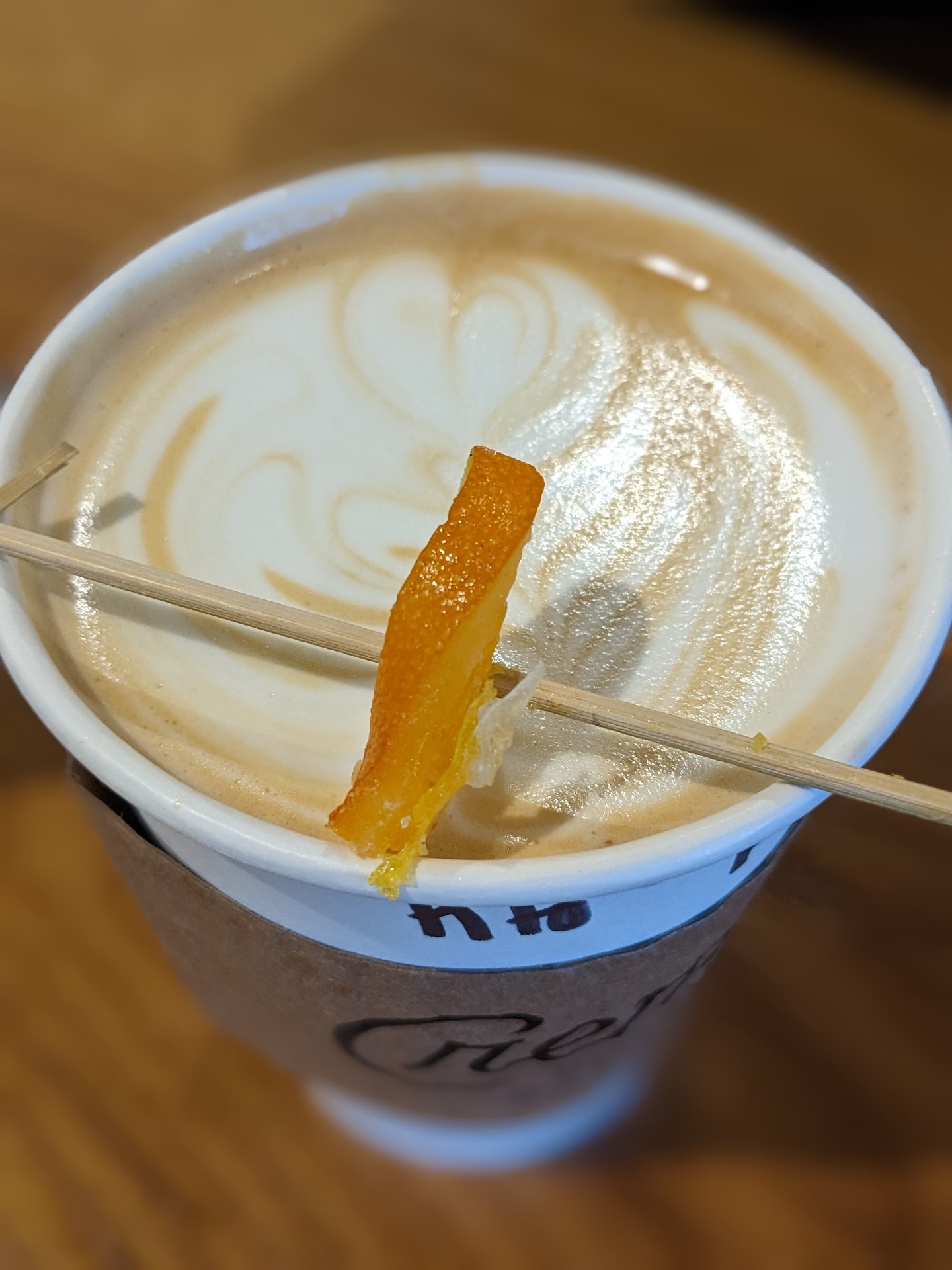 I wound up with their version of a pumpkin spiced latte. I was morbidly curious about their coffee soda, too, so I ordered that on a whim. My drinks came out quickly.