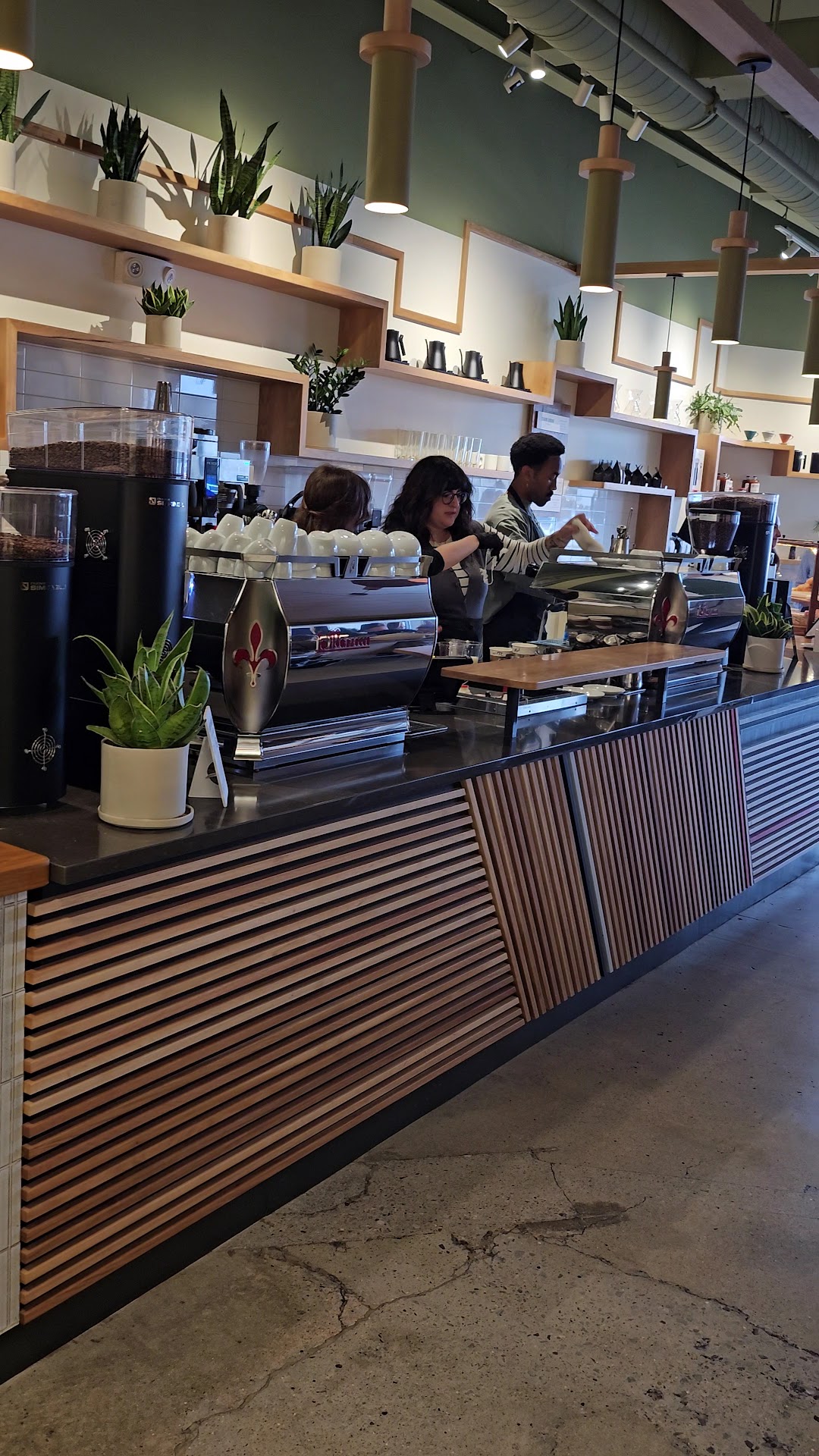 It's in a large shopping center so there's plenty of parking available. The cafe itself doesn't feel like a shopping center cafe, though -- the vibe is super refined and classy, beautiful, modern, and spacious! Lots of gentle warm light and plenty of spots to settle down. You order at the counter. They have coffee, obviously, as well as some simple meal options and pastries.