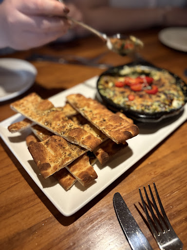 Read moreSo my girls took me here for my birthday dinner which was nice. We ordered a splint and artichoke dip for an appetizer. This was a very flavorful dip and served with a seasoned baked pita. They found out it was my birthday and brought me out a birthday card which was a nice personal touch. At the end of the meal, they brought me out a delicious crème brûlée cheesecake. For my entree, I went with the 16 oz. Ribeye ordered medium with pan seared asparagus for my side. When they brought out my steak, I had them confirm that it was a ribeye as it very much looked like a NY Strip. They assured me it was and I ate it but to me the steak did not cut like a ribeye. Because this is a high end restaurant, their cut must be a different type of more expensive cut but typically a ribeye is marbled throughout the steak. This steak only had fat around the edge and none in the middle. Again it may be a more expensive cut of meat than I’m accustomed to. The seasoning had a nice flavor but I had ordered my steak medium but it was more on the medium rare to rare temperature. When the server brought back the steak after I had sent it back thinking it was a different cut, he did say if something is not right, they would make it right. At that point I had not yet cut into my steak to see it was more undercooked than I liked. This made for the cutting and chewing of the steak more difficult. I could have tracked them down and asked for it to be cooked a little more but once the food hit the table, they didn’t come back for a bit. The asparagus was tasty but I did have a few stalks where the bottoms of the stalks were not cut off high enough and those were fibrous and I had to spit those out. My wife had the roasted chicken and she liked it pretty good. One of my daughters had the fish and chips and it was a good bit of food. She thought it was tasty and had to take part of it home as it was too much to eat. My other daughter just had a Caesar salad so there is not much to say about a salad. The service was very friendly and personable and were constantly filling drinks when needed. We did not order any alcohol but you can still expect to pay $35 to $55 per person depending on what is ordered. I can’t say that I wasn’t disappointed with my steak. For $55, I expected it to be much better. I would like to give this place another try because I still don’t think my cut was ribeye. The atmosphere was a bit loud and hard to talk at times. The music playing was loud as well. For a restaurant of this quality, I would have thought a lighter style of music should have been playing to make it more elegant. Because of my meal, I can’t give more than three stars but know they are better...