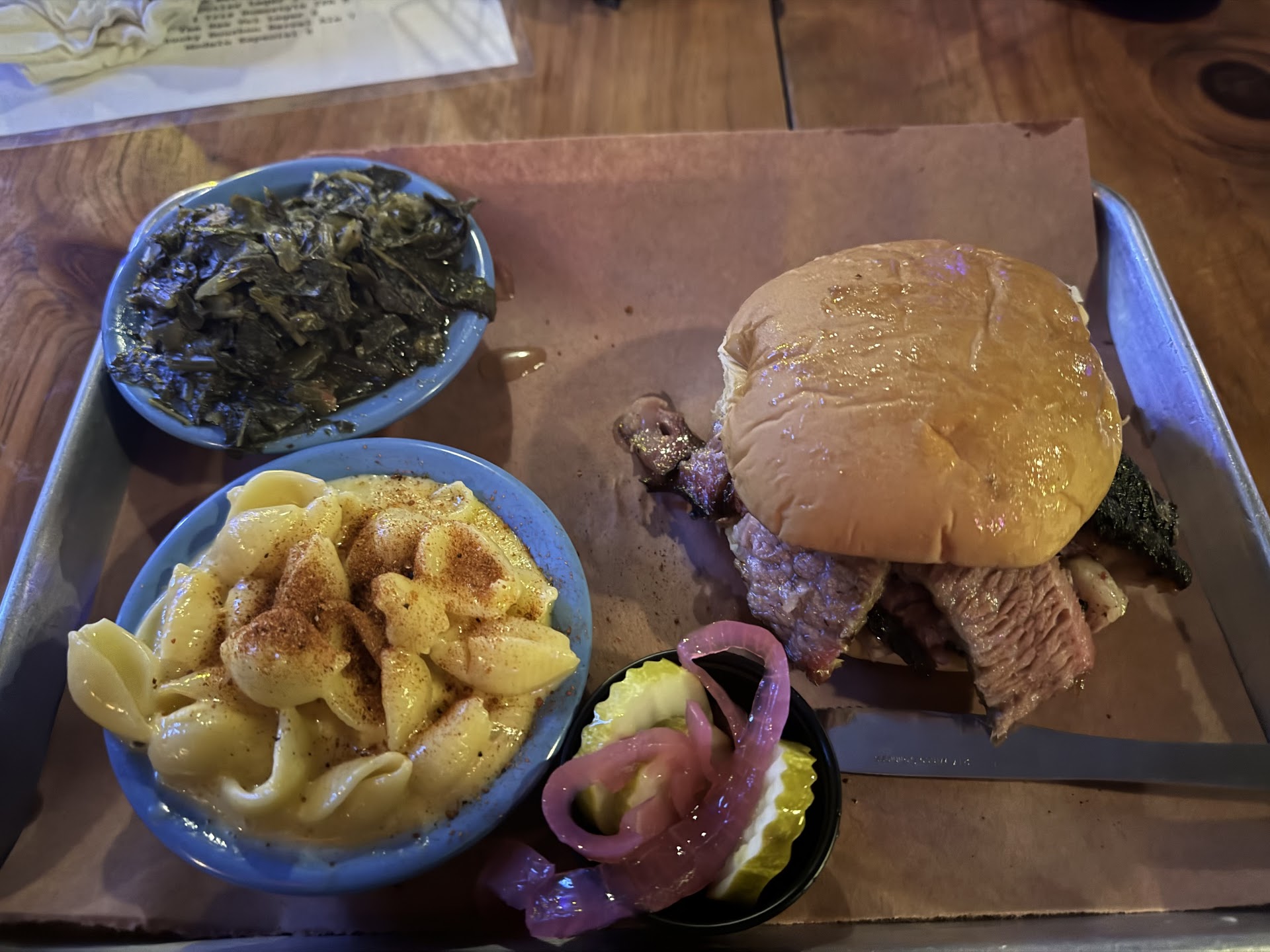 I always look for green beans on a menu at a barbeque joint, it's key to the BBQ experience for me. Judge Beans gots the beans! And they were delicious! Also, if you're going to serve pulled chicken, you really should offer the white sauce. That's what MAKES pulled chicken. Judge Beans has that, too. Their white sauce has a thick consistency, and if not the best I've ever had, it's pretty freaking close. Can't think of a better one off the top of my head...if you've never had white sauce, try it. Unless you hate mayonnaise, then don't try it. White sauce is mayonnaise based and sometimes has a little horseradish. It's SO good on poultry. Now...I had the the pulled pork plate with green beans, obviously, and fried okra. The fried okra was really crunchy and delicious, and at least half a pound of it on my plate. The hubby got the pulled pork and pulled chicken plate with turnip greens and mac n cheese. That white sauce though...🤤 he also really liked the BBQ sauce that came with the pork, it's more of a vinegar based sauce, which is not my thing. But they had a thick sweet on the table and that IS my thing. And it was good with a little of that vinegar based mixed in. It came served on those shallow metal trays which are perfect for barbeque. Plenty of space to experiment with the sauces. They also have their own Judge Beans pepper sauce you could mix in for a little extra kick. We both had the sweet tea, it wasn't overly sweet, so it was really good. I really wanted to try the sweet potato fries, but I knew I would never finish HALF of what I had on my plate. So, next time, I'm getting those for sure. There were so many yummy looking items on the menu and not enough room in our stomachs. They also had a full service bar, saving that for next time as well. No idea if they have dessert, didn't make it that far. 🤣 Now we discuss the staff. It's a seat yourself kind of place but we were still greeted at the door by Emma. She cleaned our table, brought us menus and silverware, took our drink order and then gave us plenty of time to review the menu without us feeling forgotten. She constantly acknowledged us and checked on us. I observed her with the other patrons and there was an older gentleman with a LOT of questions and she was so kind and patient with him and incredibly helpful. She was thorough in her explanations and brought us to go boxes and a bag to put them in, that's actually important information because most places don't give you a bag and without a bag our leftovers would have been on the ground in the parking lot. I'm known for dropping food. 😬 Anyway Emma was exceptional and we'll...
