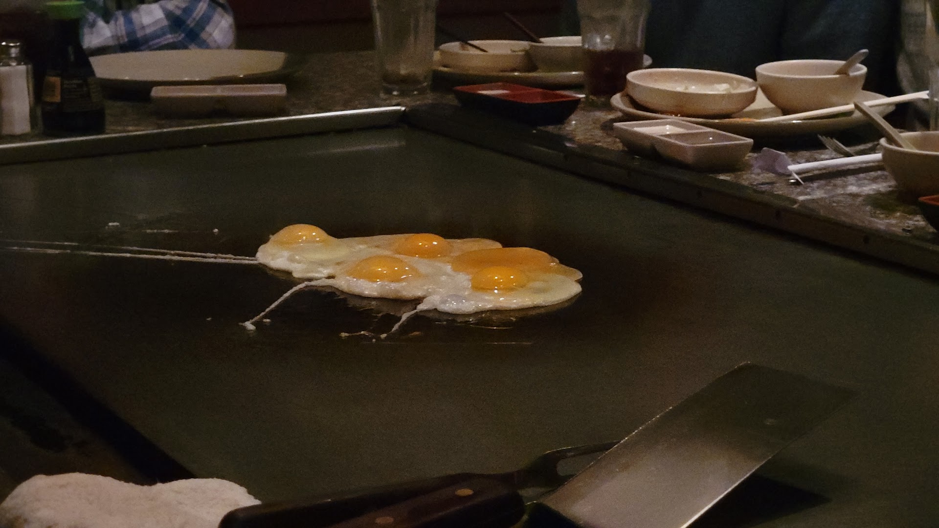 The chef was an older gentlemen who did virtually nothing showy while he cooked and never smiled or engaged the group in front of him. He tried twice to break an egg in half by throwing it in the air and splitting it with a sideways spatula, missing both times. The only other thing he did was the onion volcano. No funny tricks, no throwing eggs into his hat or pocket or whatever. I wanted my girlfriend to really enjoy the experience and it was a depressing display compared to what Shogun had led me to expect in the past.