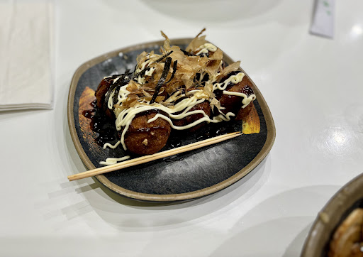 The takoyaki is adorned with a harmonious blend of tangy okonomiyaki sauce, creamy Japanese mayonnaise, and a sprinkling of smoky bonito flakes that dance with the heat of the freshly prepared dish. It’s a feast for the senses, both visually and in flavor, embodying the craftsmanship and attention to detail that Teapot exemplifies.